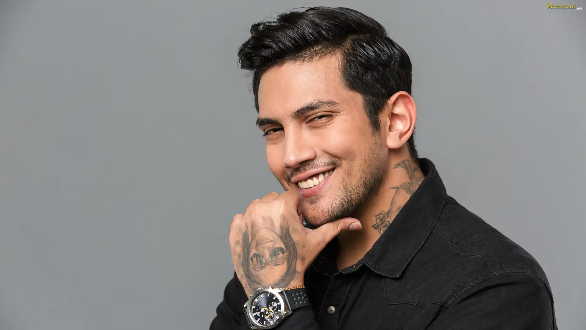 Mężczyzna, Brunet, Uśmiech, Czarna, Koszula, Zegarek, Tatuaże