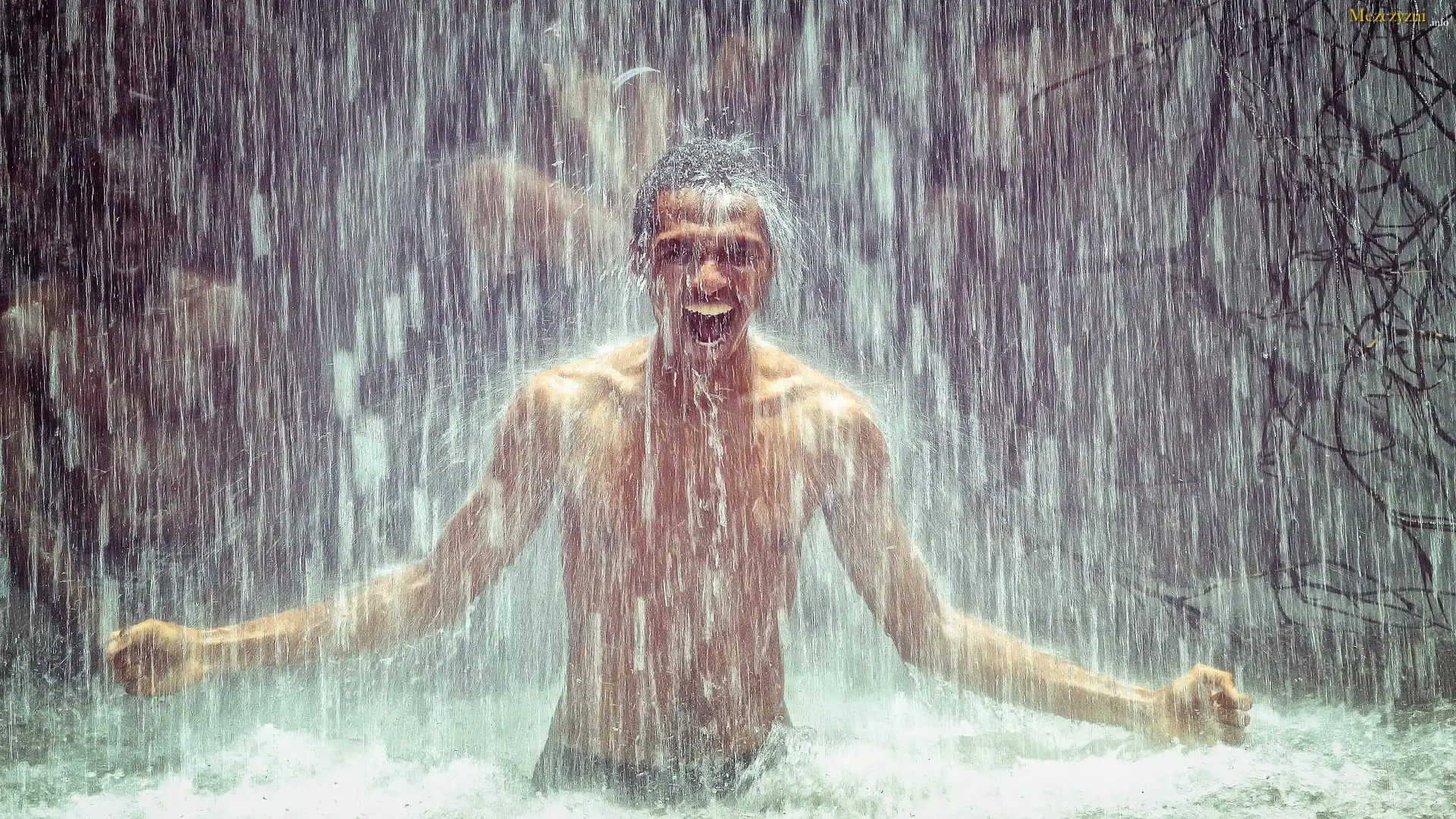 Chłopak, Wodospad, Woda, Śmiech
