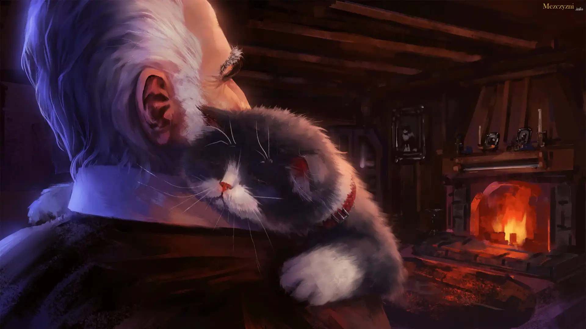 Grafika, Mężczyzna, Kot, Kominek
