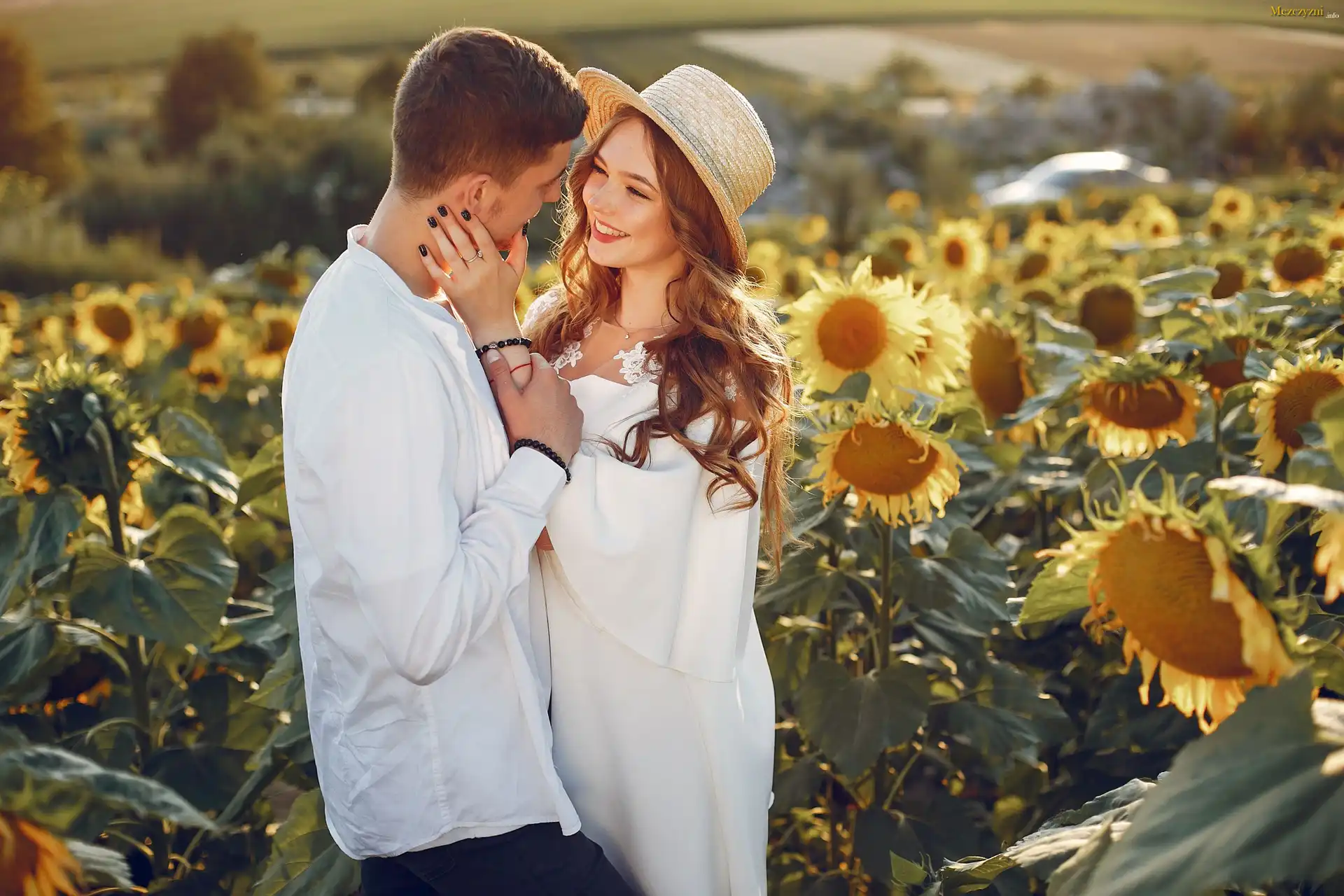 Pole, Słoneczników, Para, Kobieta, Kapelusz, Biała, Sukienka, Mężczyzna, Koszula