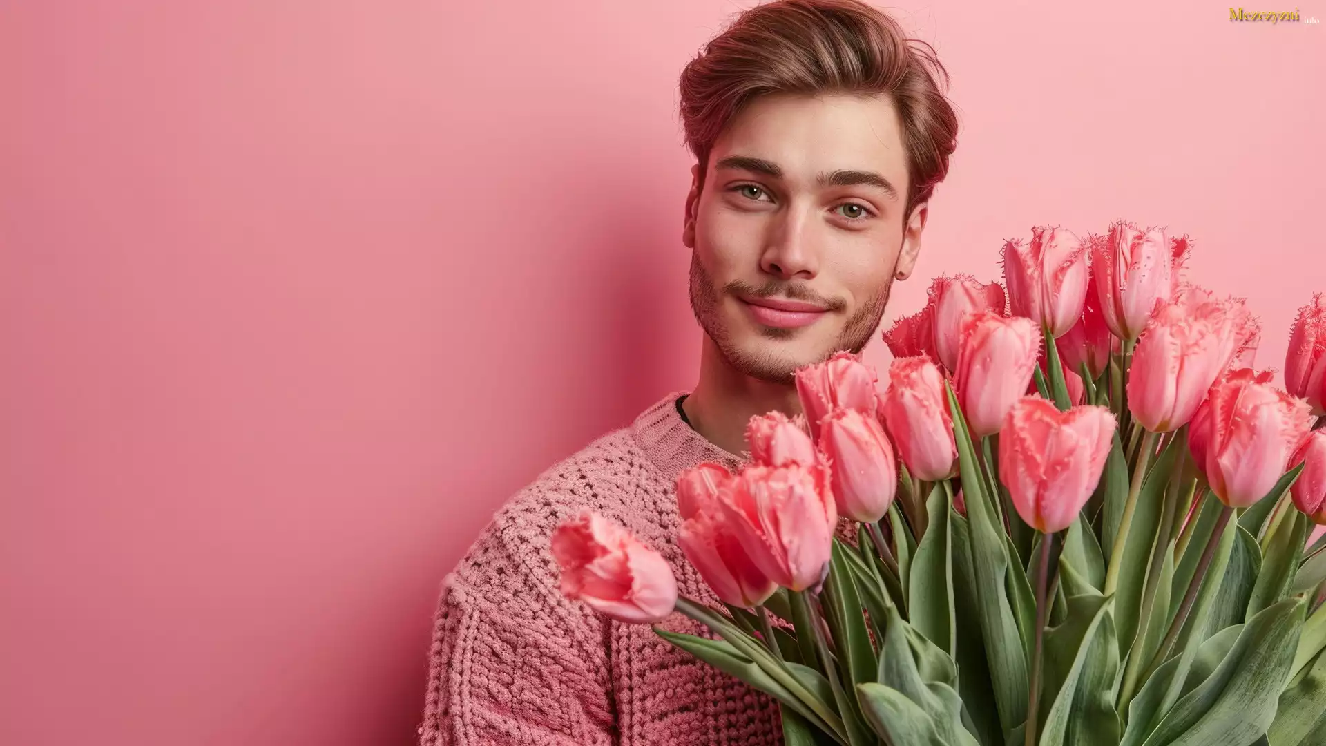 Mężczyzna, Kwiaty, Bukiet, Różowe, Tulipany