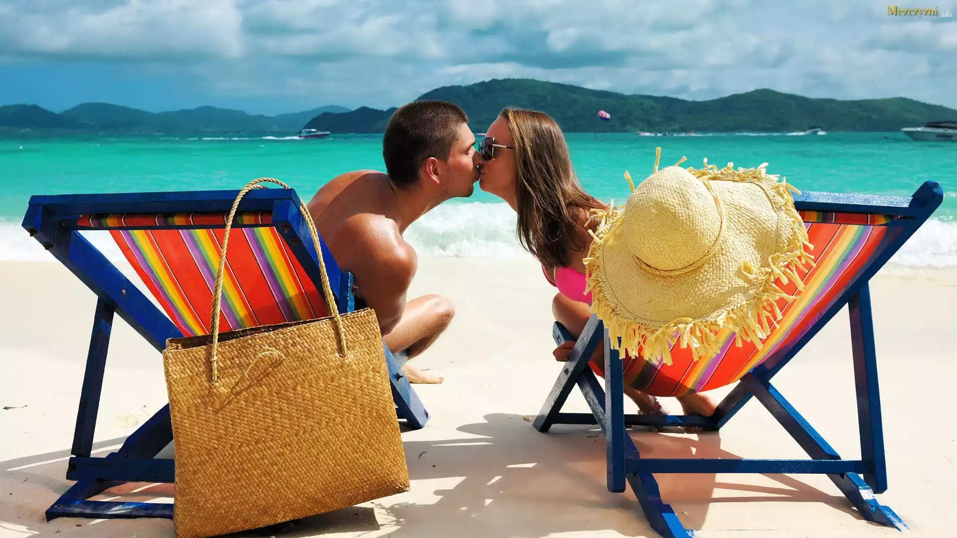 Lato, Wakacje, Kobieta, Mężczyzna, Morze, Plaża, Leżaki, Kapelusz, Torba, Pocałunek, Miłość