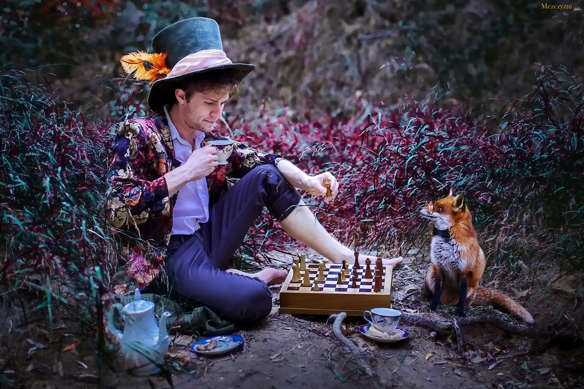 Lis, Mężczyzna, Szachy, Gra, Trawa