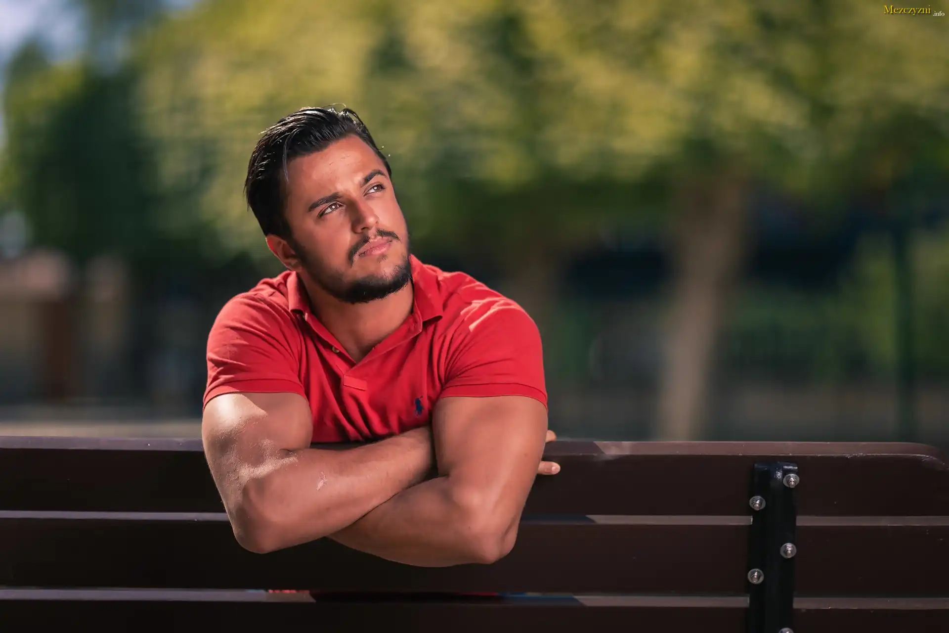 Mężczyzna, Broda, Czerwona, Koszulka, Ławka
