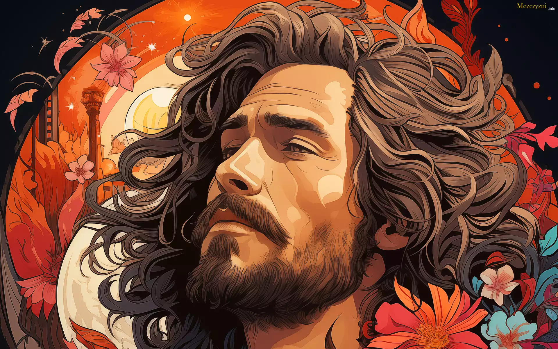 Grafika 2D, Długowłosy, Mężczyzna, Zarost, Kwiaty