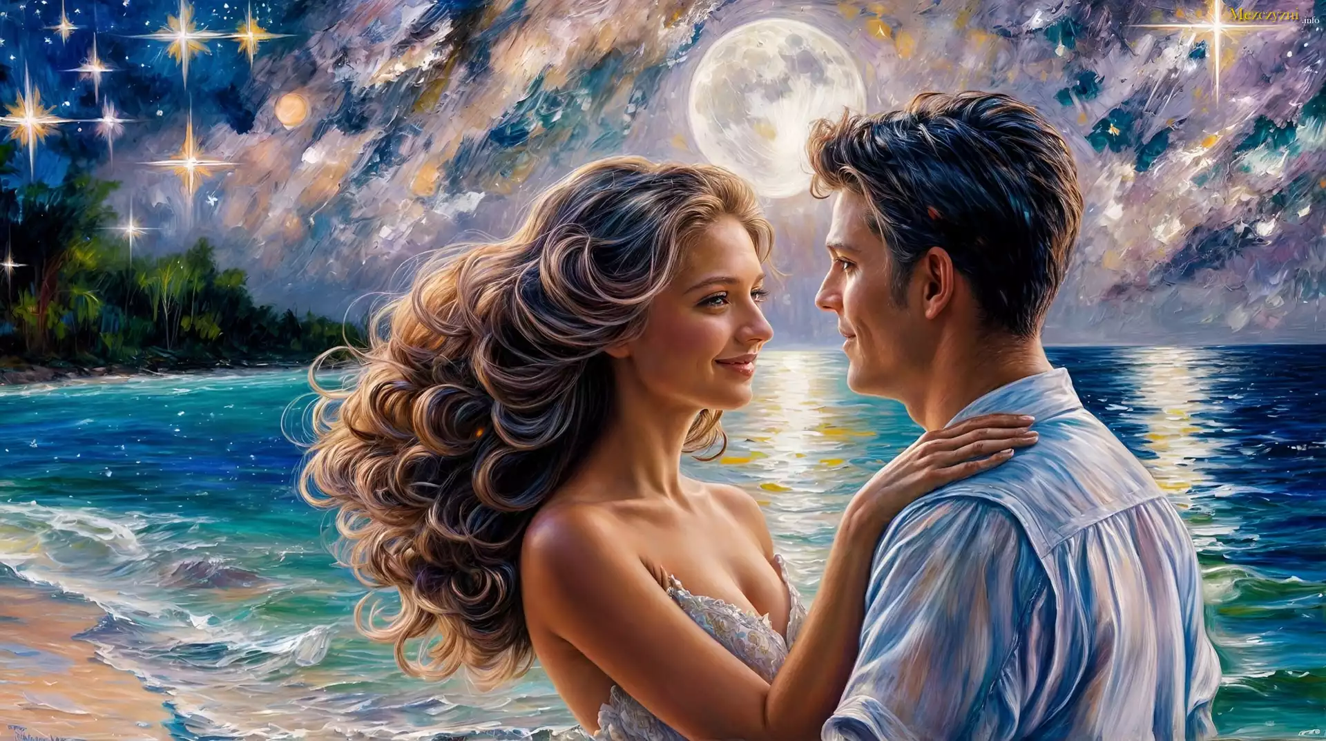 Kobieta, Mężczyzna, Morze, Księżyc, Grafika
