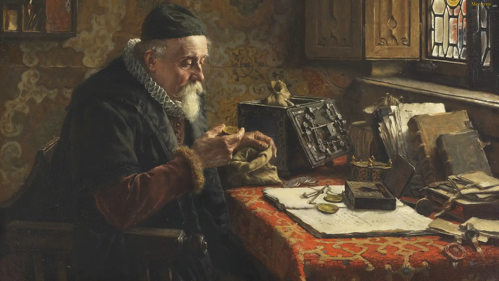 Malarstwo, Obraz, Max Gaisser, Mężczyzna, Worek, Monety, Książki, Stół, Okno