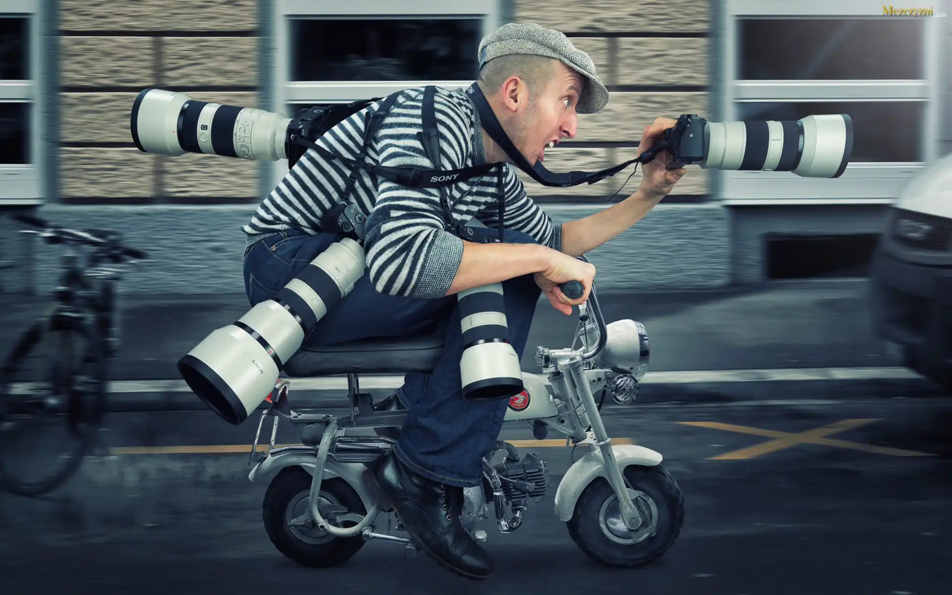 Śmieszne, Mężczyzna, Fotograf, Paparazzi, Motorower