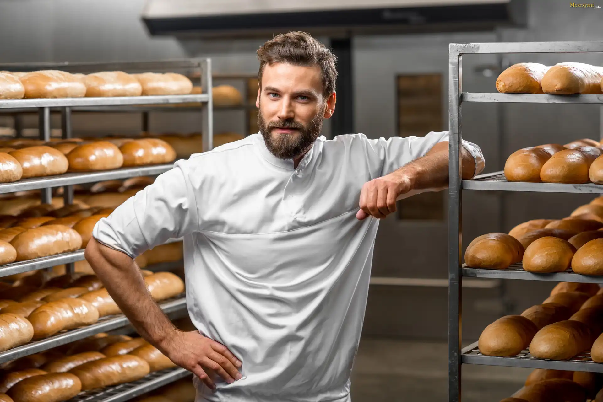 Piekarnia, Regały, Bochenki, Chleb, Mężczyzna, Piekarz