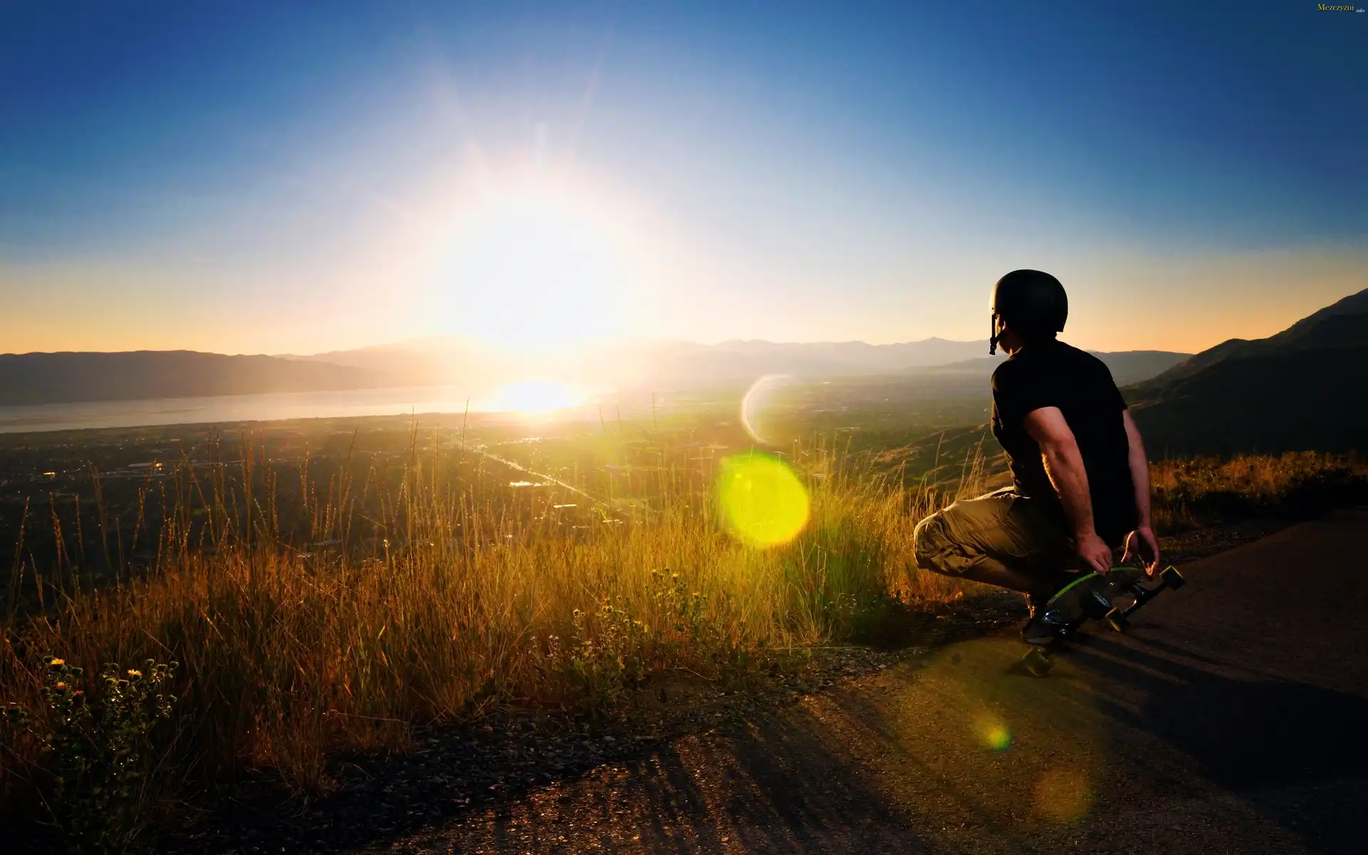 Promienie, Słońca, Jezioro, Łąki, Mężczyzna, Deskorolka