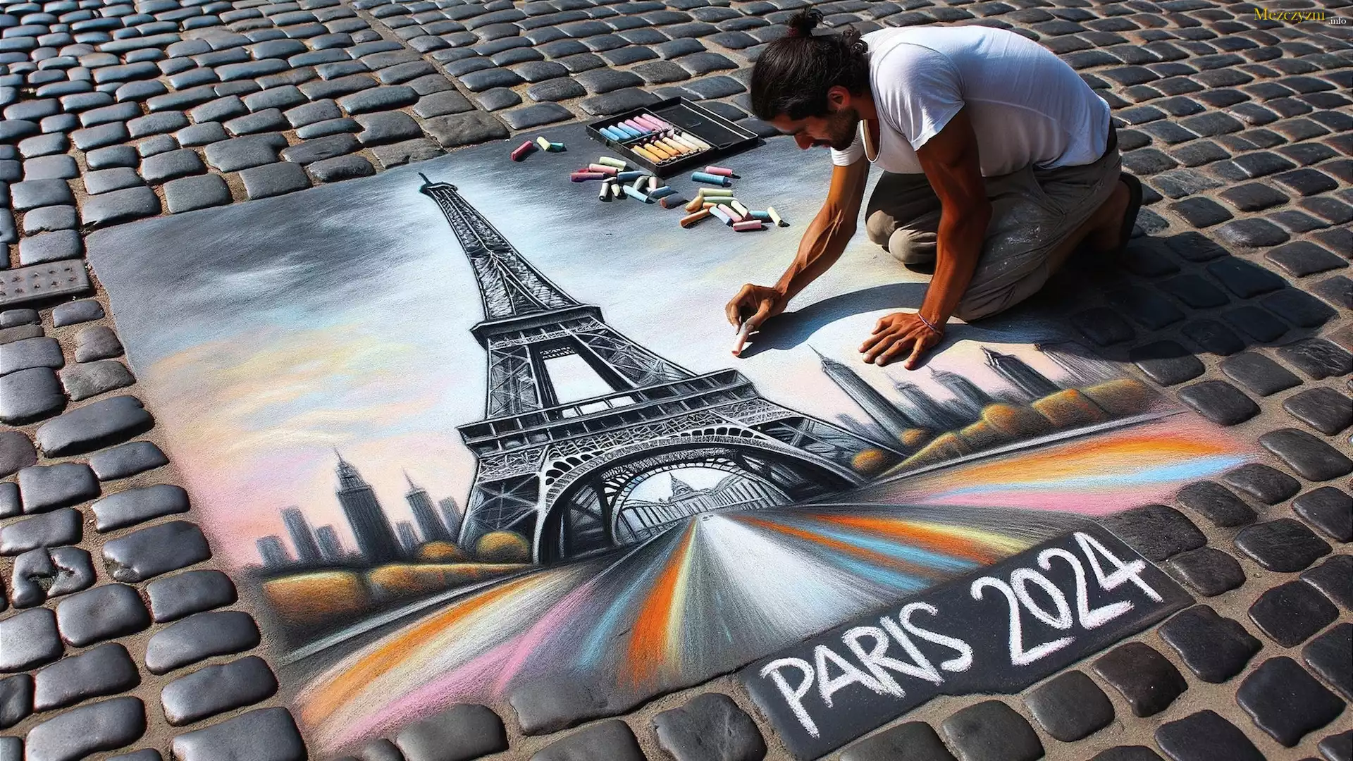 Grafika, Mężczyzna, Ulica, Bruk, Wieża Eiffla, Kreda, Rysunek