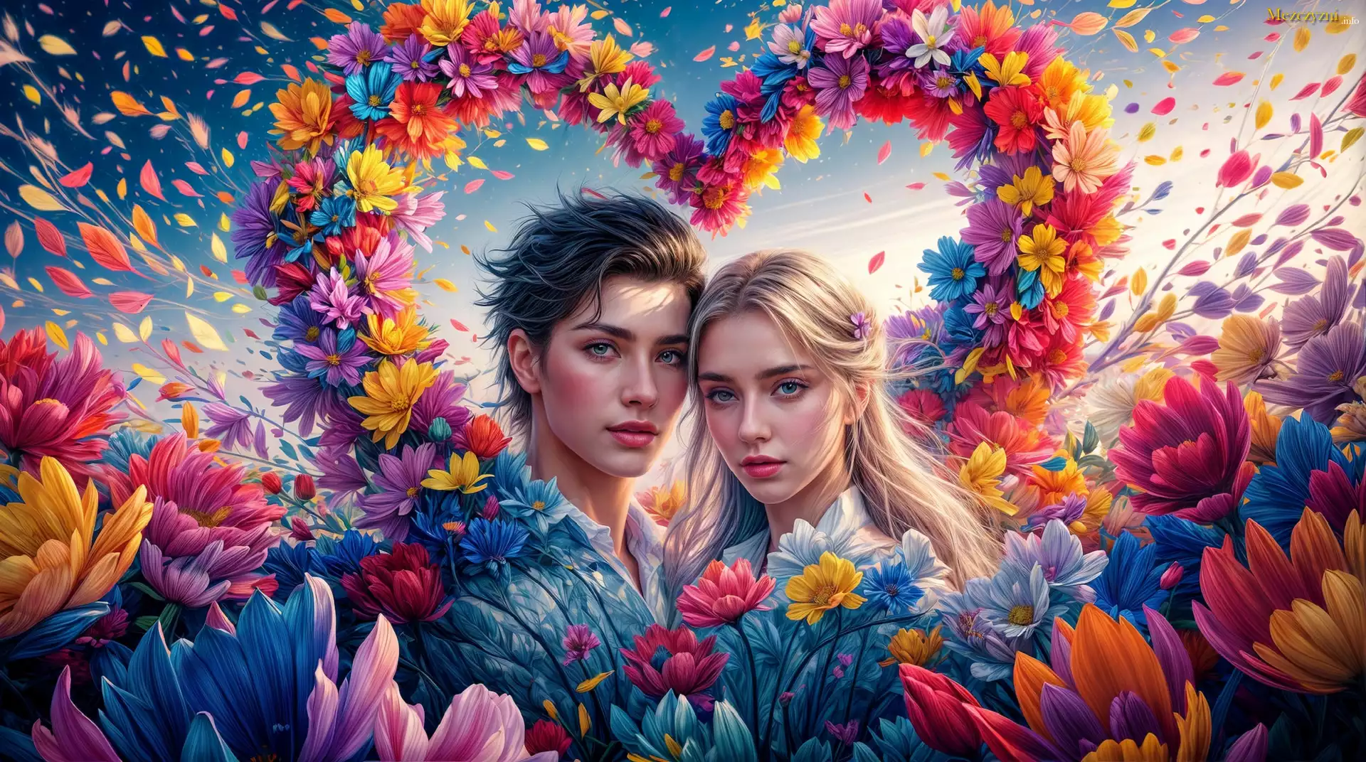 Kobieta, Mężczyzna, Para, Serce, Kwiaty, Grafika