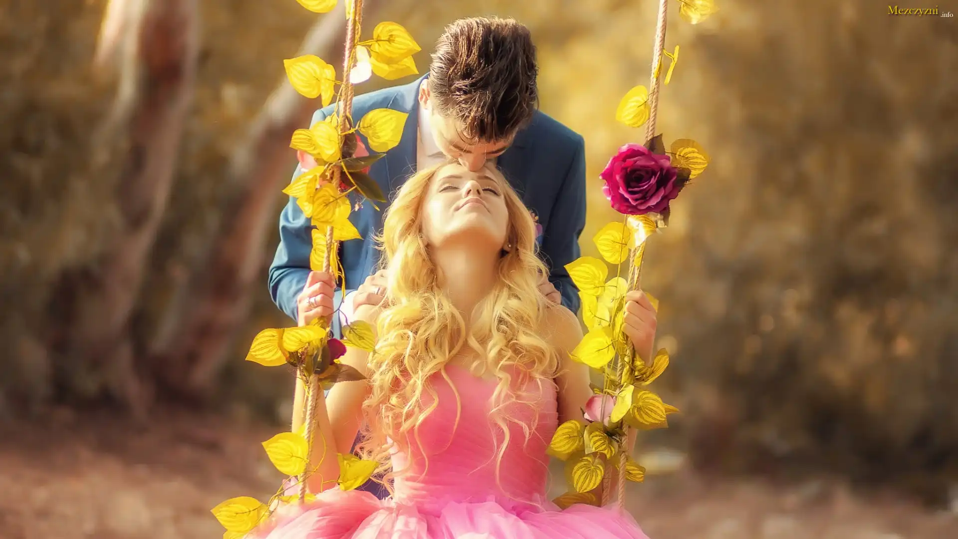 Para, Zakochani, Kobieta, Mężczyzna, Miłość, Huśtawka, Liście, Róża