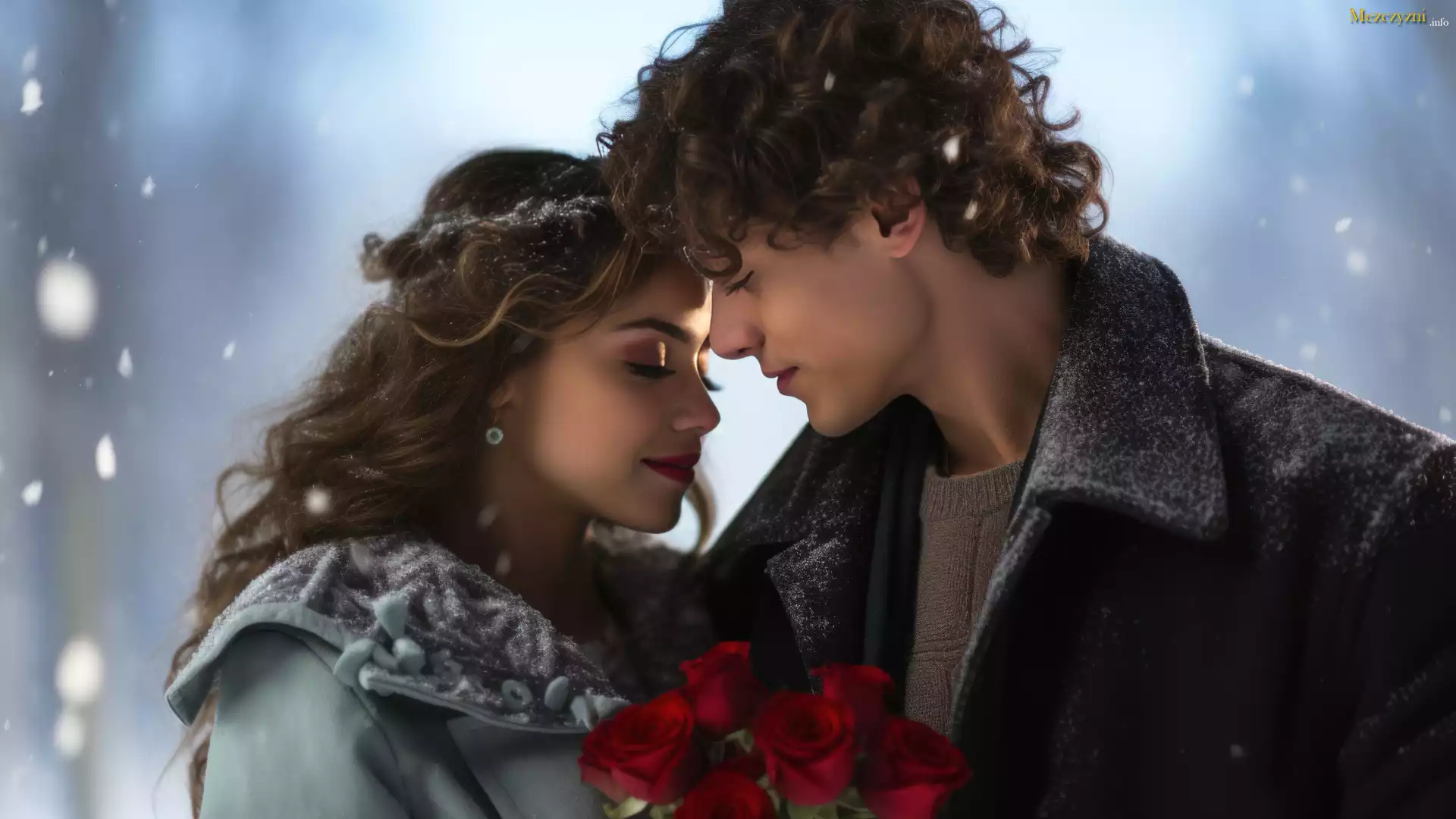 Zima, Kobieta, Mężczyzna, Para, Zakochani, Śnieg, Czerwone, Róże, Bukiet, Grafika