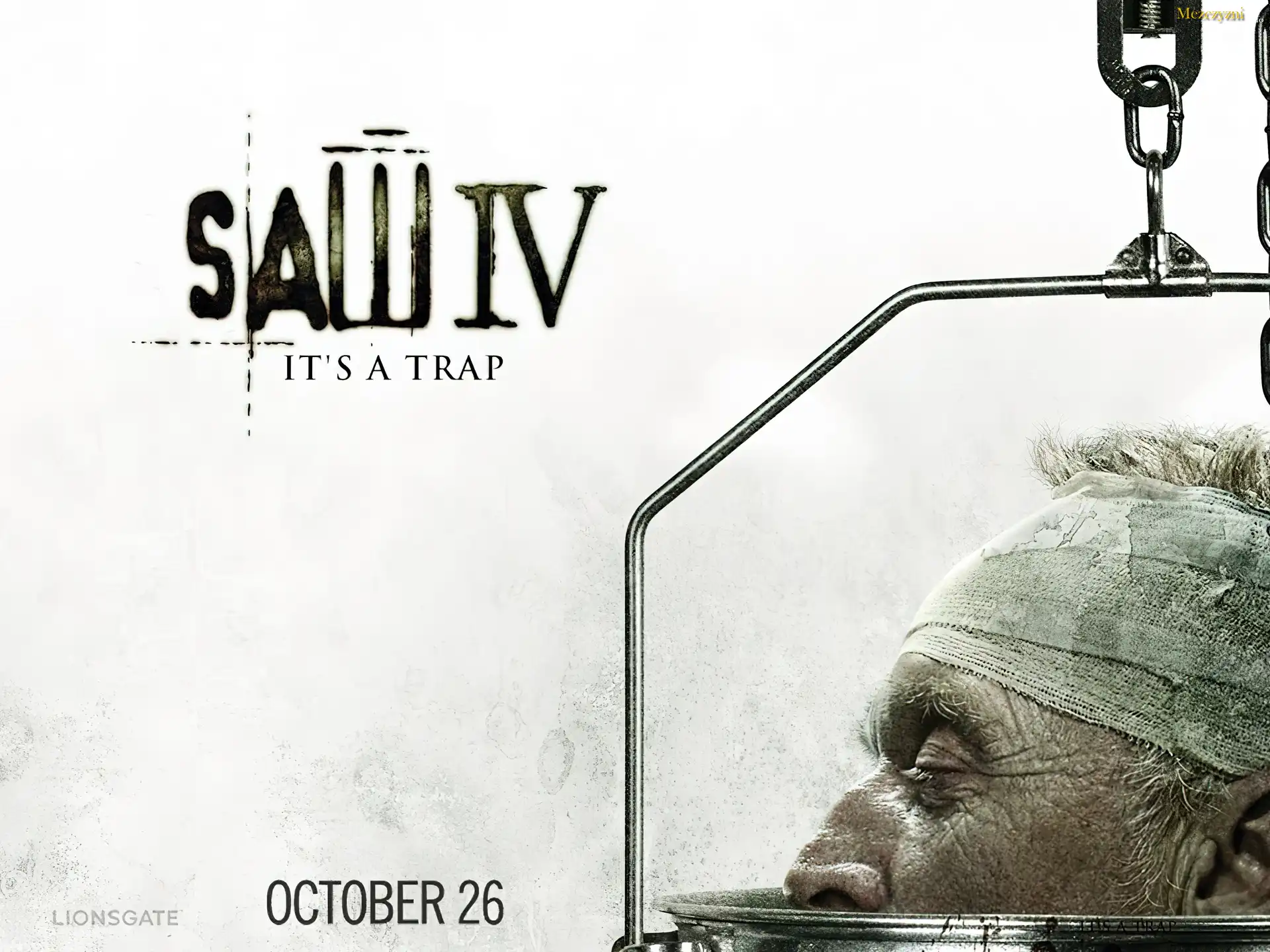 Piła 4, głowa, bandaż, napis, Tobin Bell