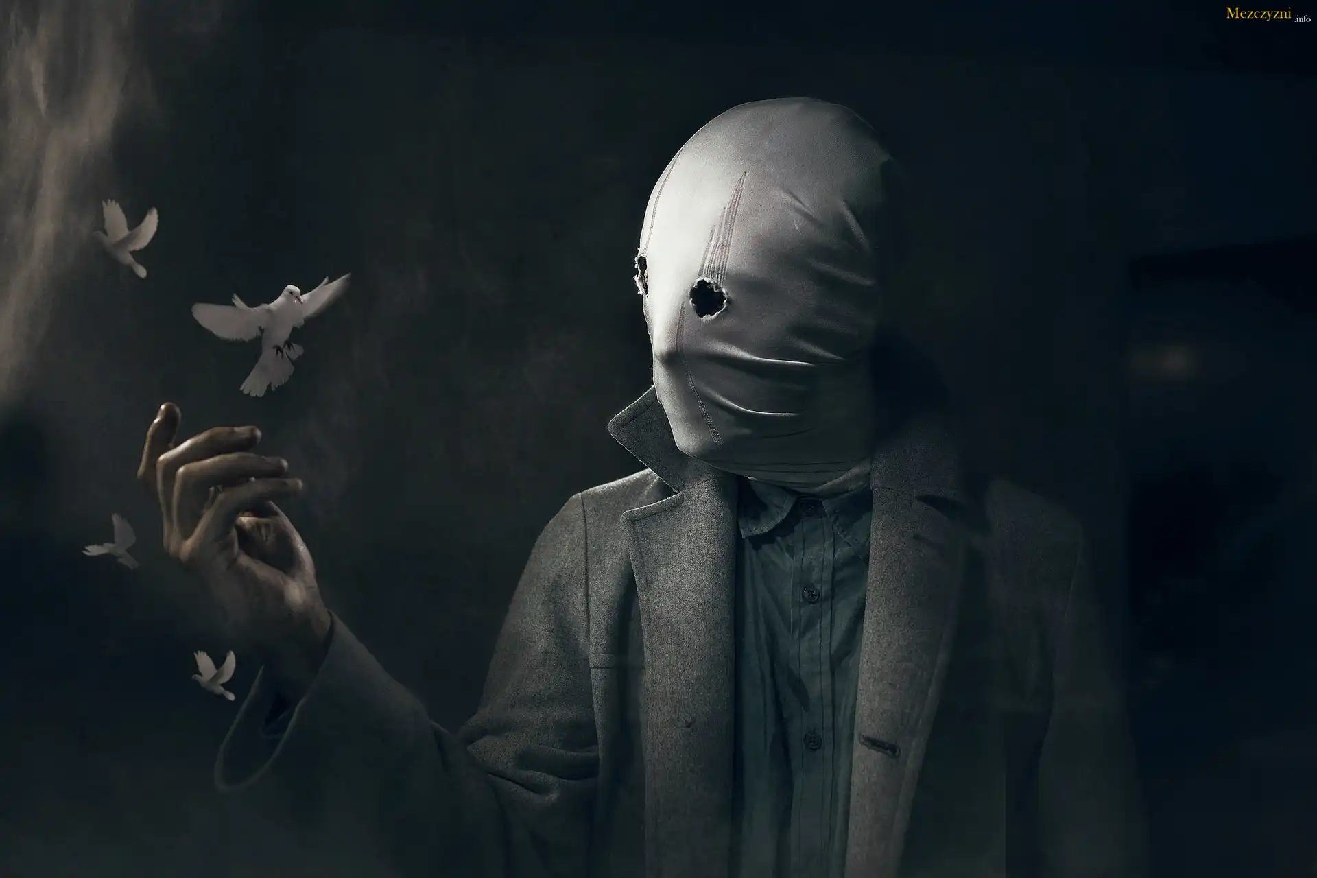 Człowiek, Maska, Ptaki, Gołębie, Tło czarne