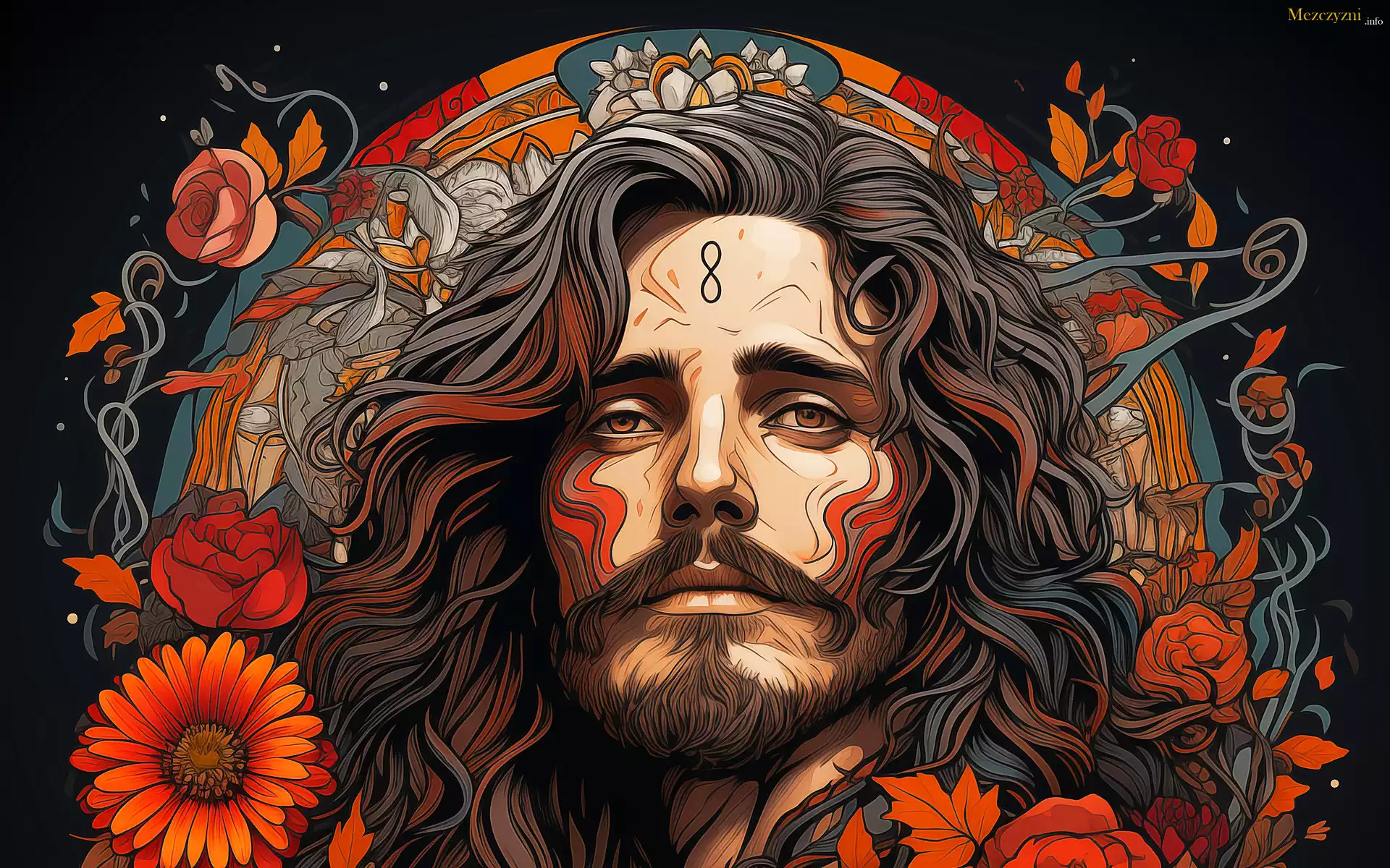 Grafika, Długowłosy, Mężczyzna, Zarost, Kwiaty