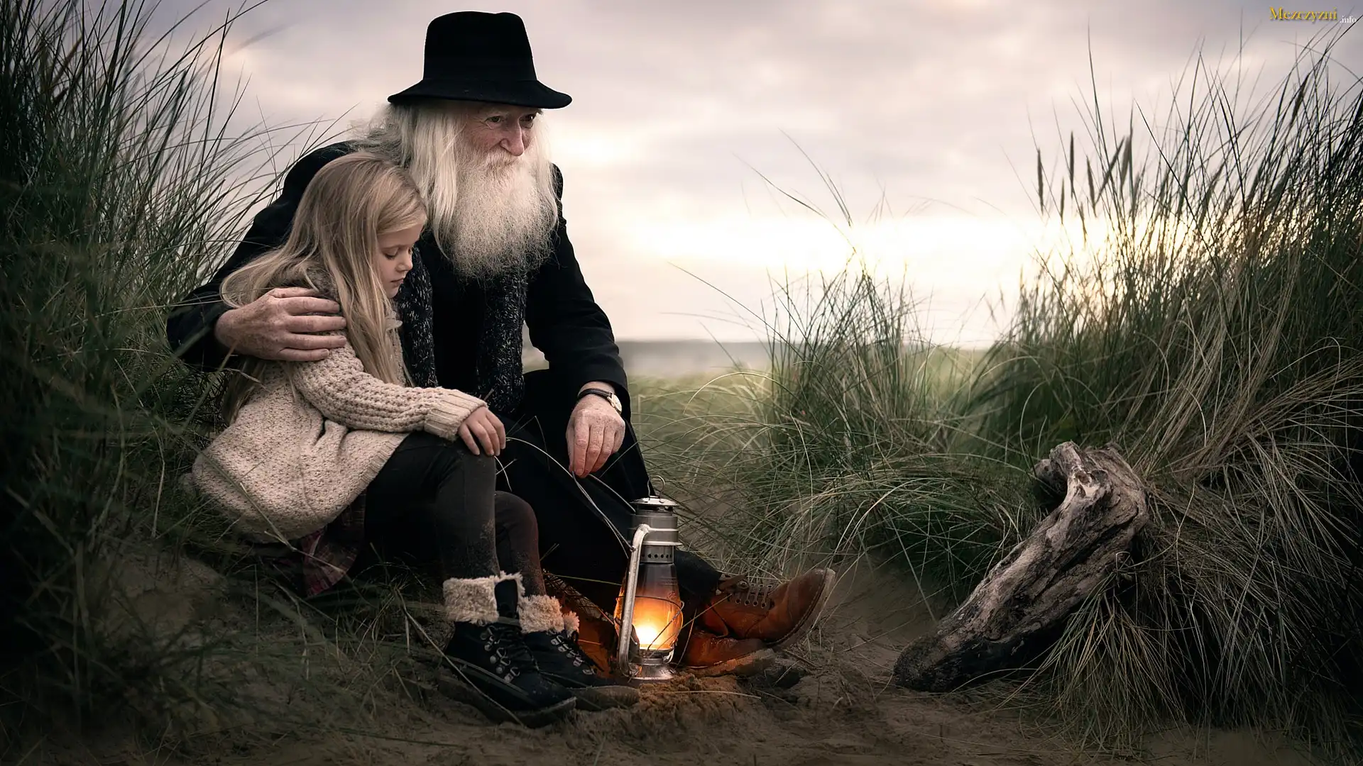 Dziadek, Dziewczynka, Lampa, Trawy