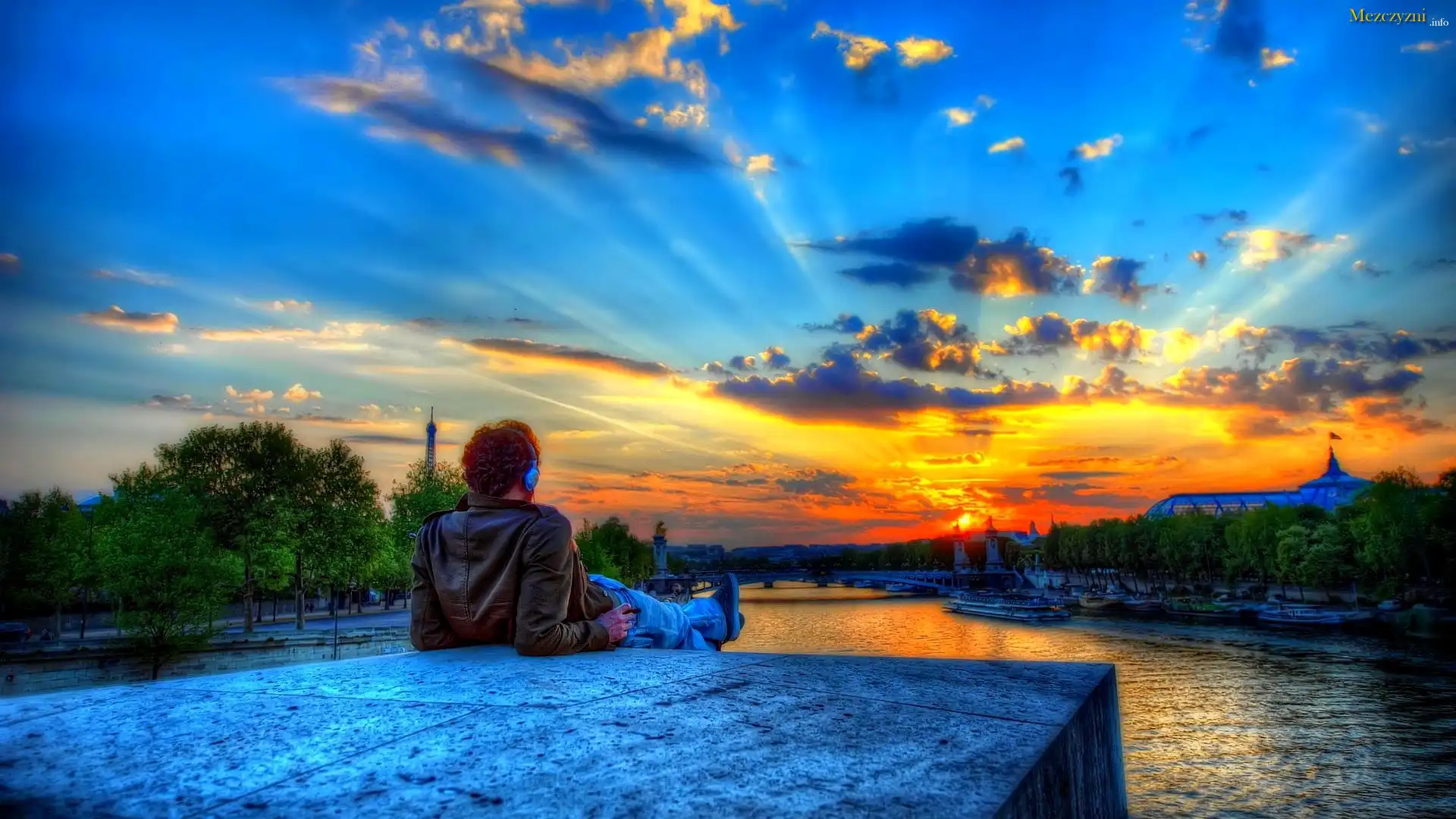 Francja, Paryż, Rzeka, Zachód, Słońca, Mężczyzna