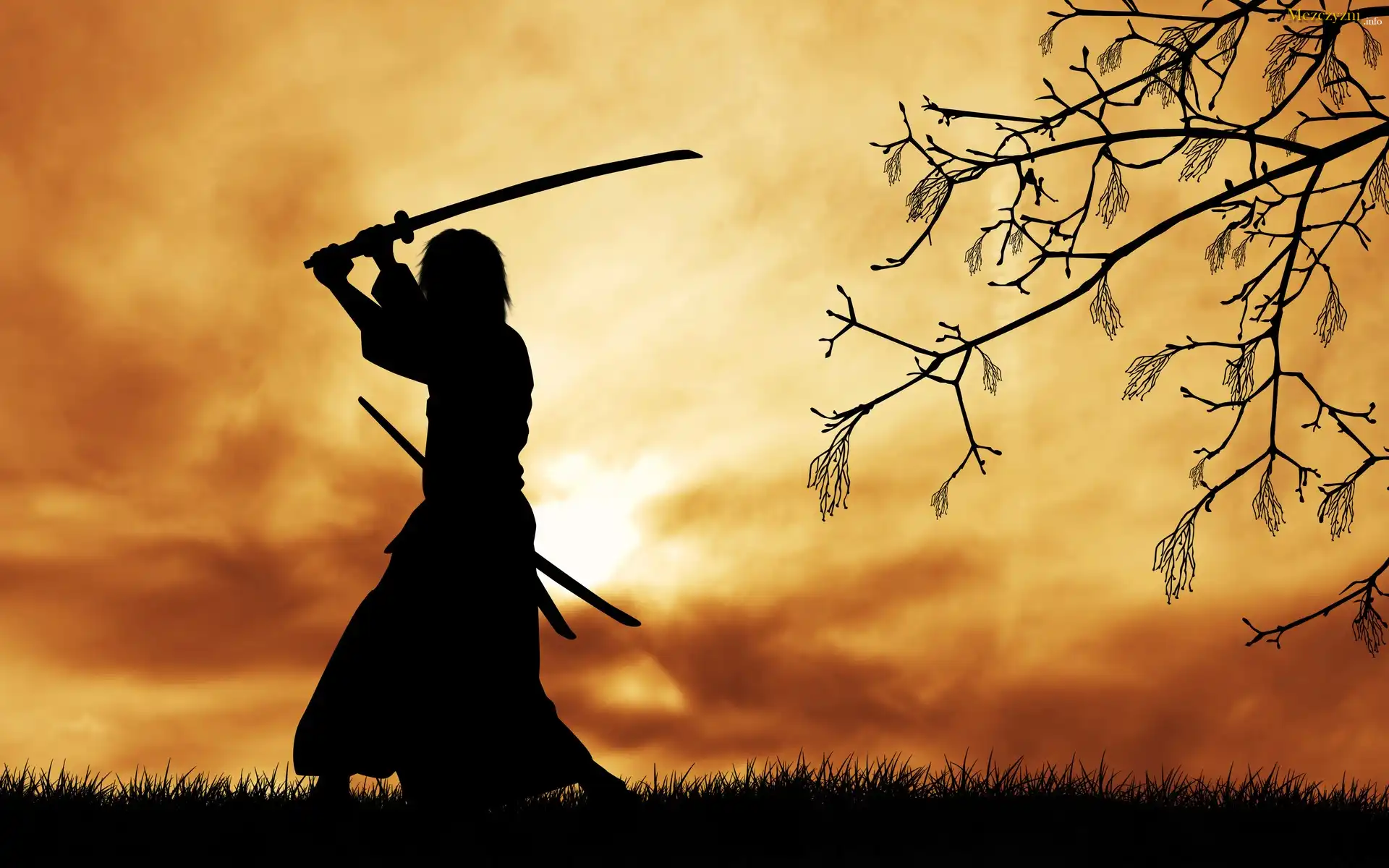 Grafika, Zachód, Słońca, Drzewo, Samuraj