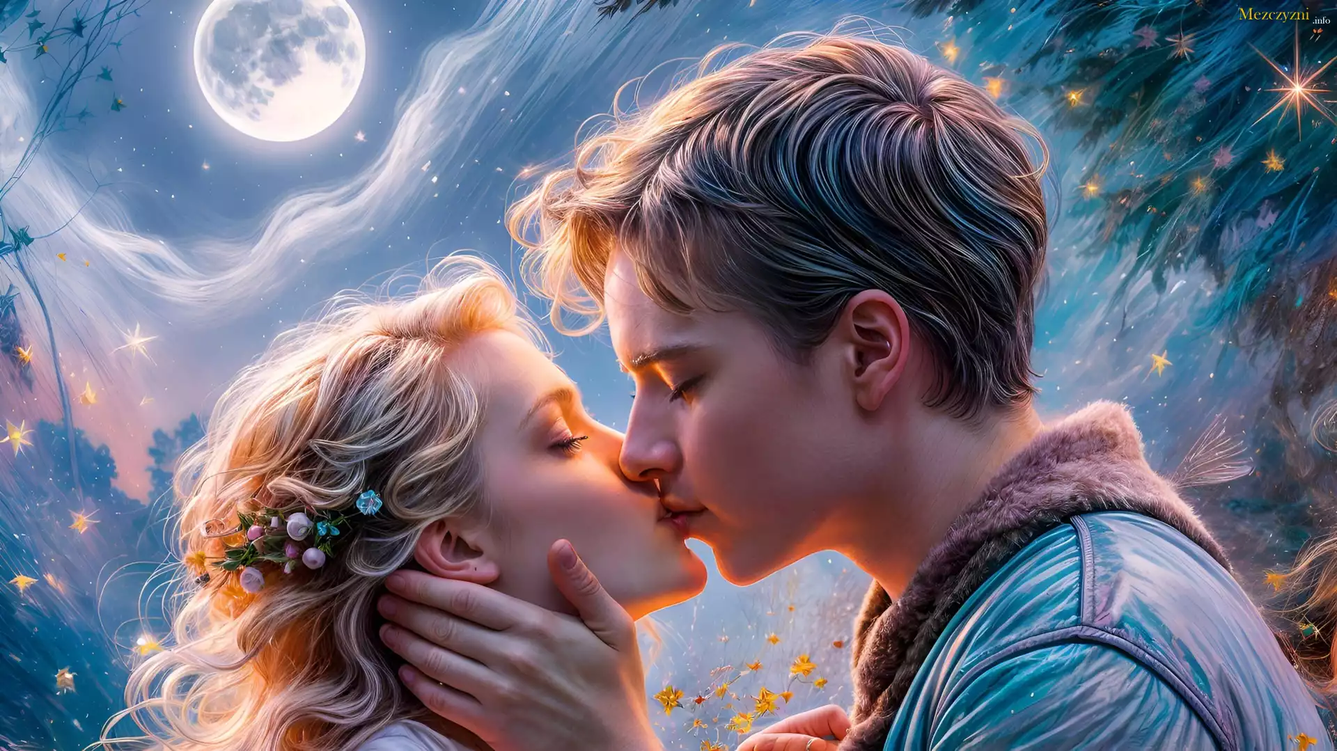 Para, Zakochani, Miłość, Pocałunek, Księżyc, Kobieta, Mężczyzna, Grafika