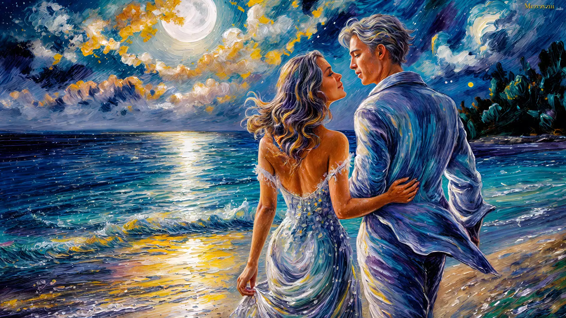 Para, Zakochani, Morze, Księżyc, Grafika, Kobieta, Mężczyzna, Grafika