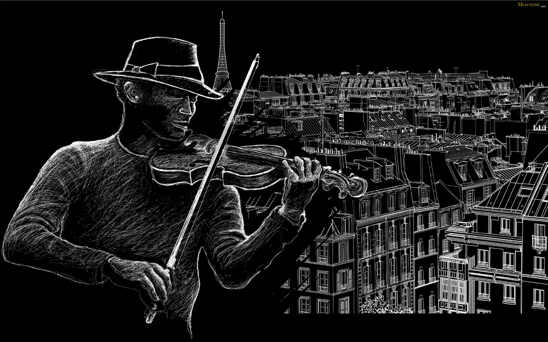Grafika, Mężczyzna, Skrzypce, Panorama, Miasta