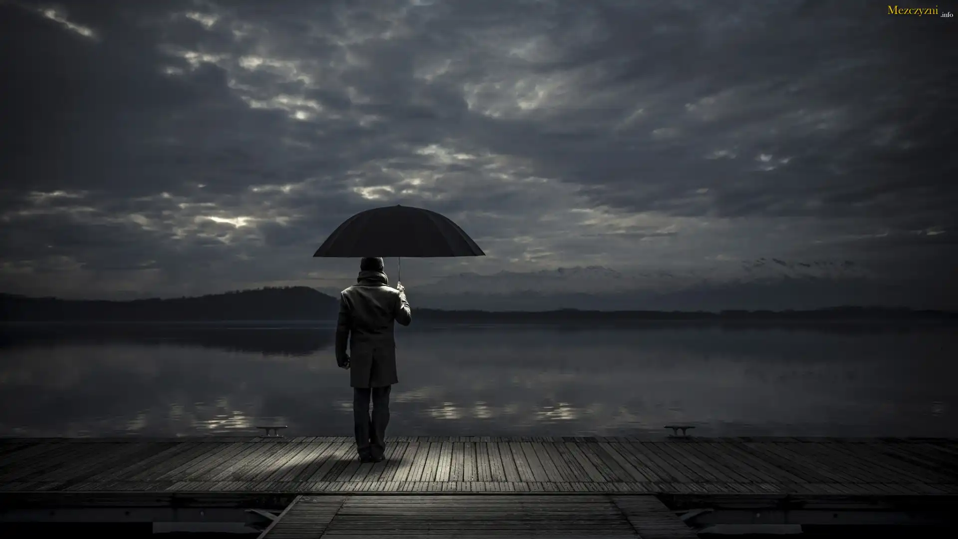 Jezioro, Pomost, Mężczyzna, Deszcz, Parasol