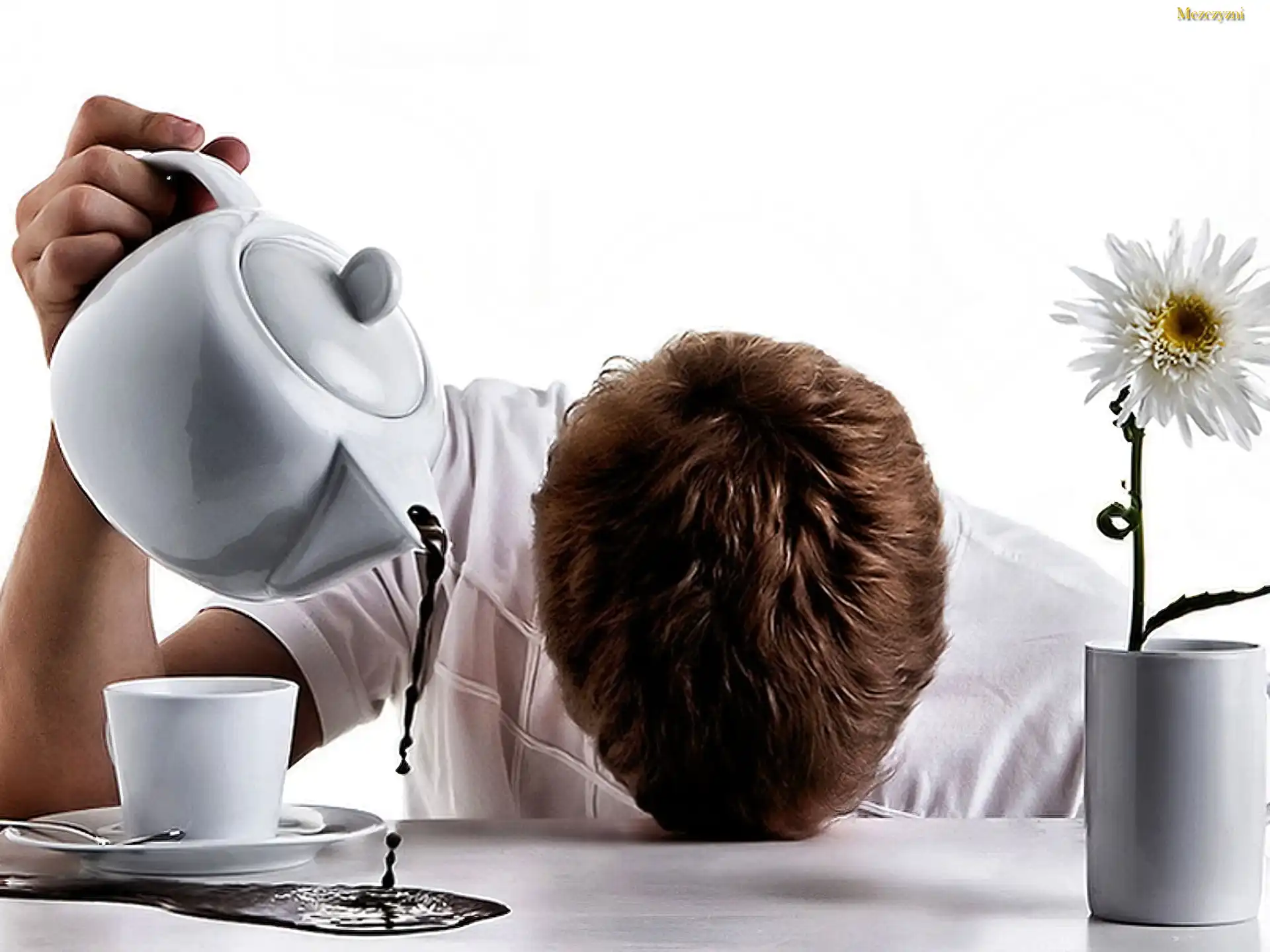Śpiący, Mężczyzna, Kawa, Kwiatek