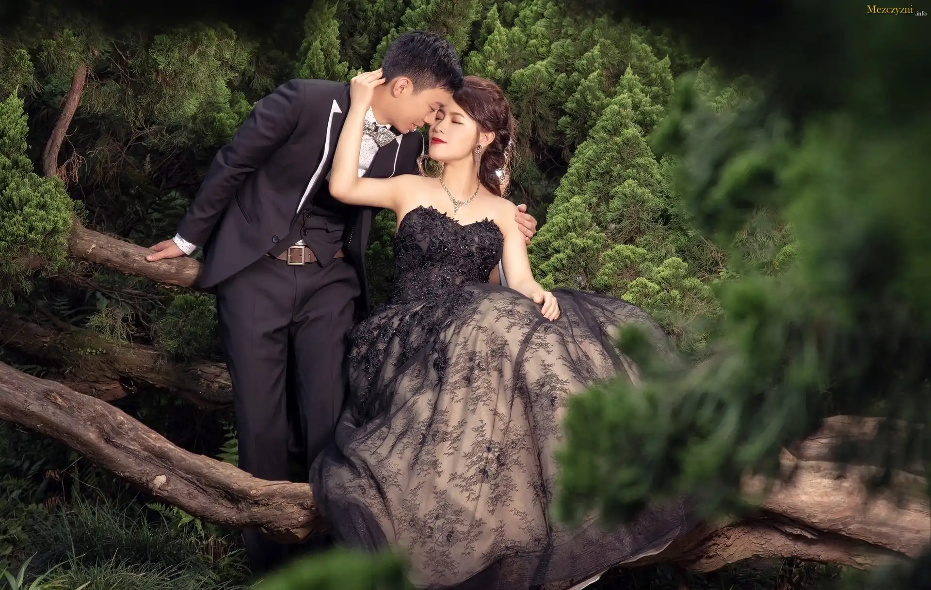 Kobieta, Czarna, Suknia, Mężczyzna, Konary, Drzewa