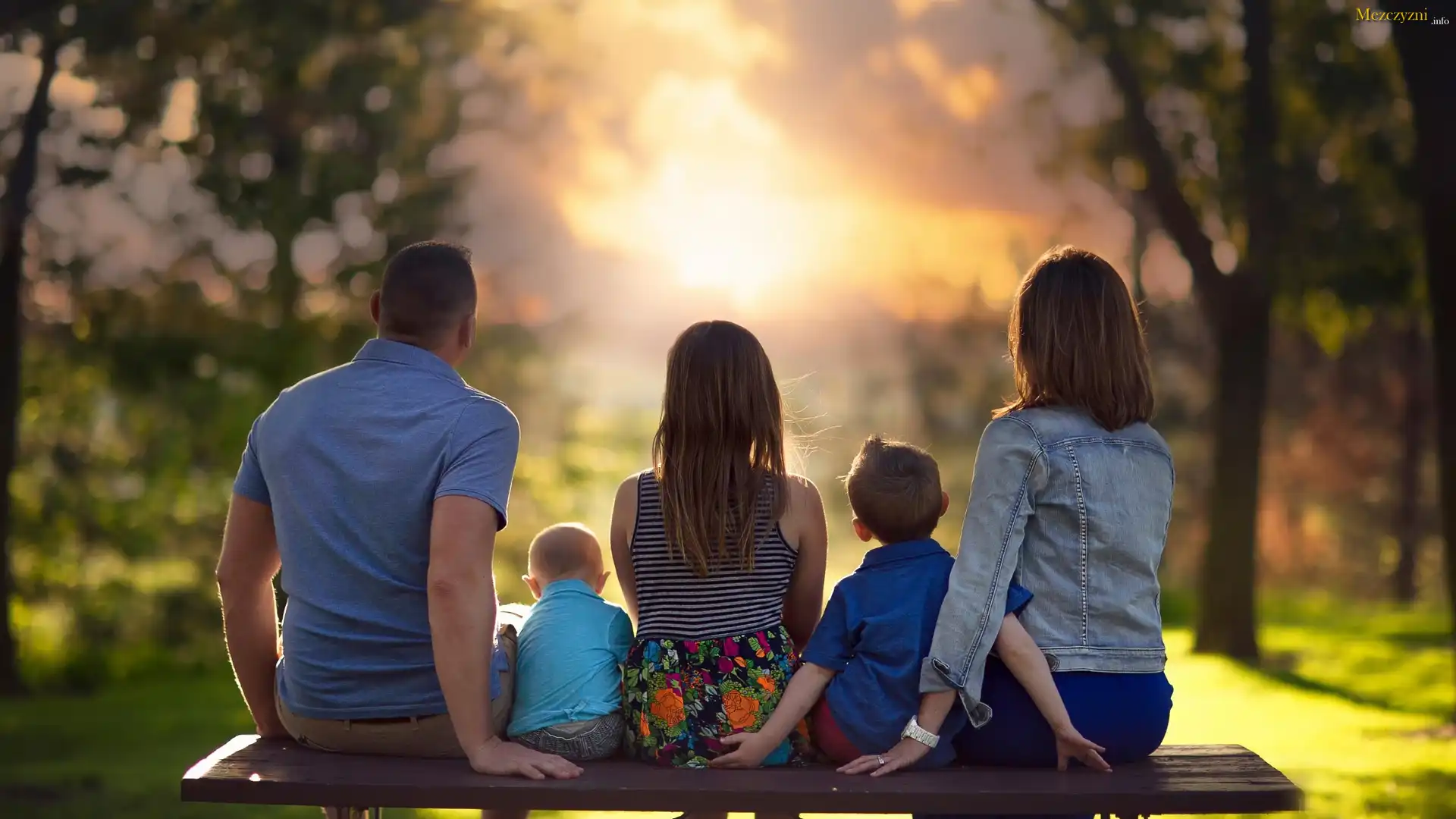 Mężczyzna, Kobieta, Dziecko, Rodzina, Ławka, Zachód słońca