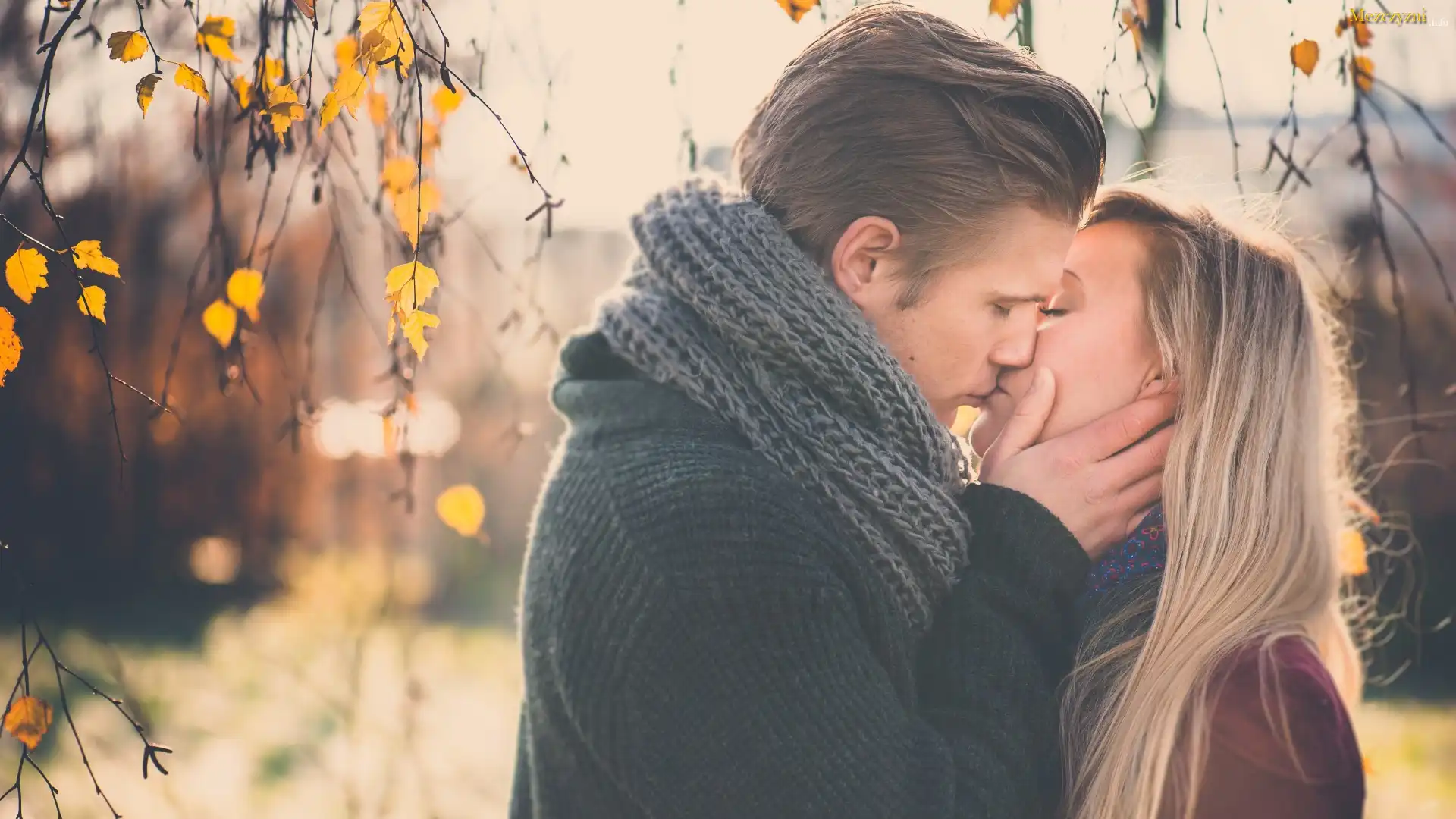 Para, Kobieta, Mężczyzna, Pocałunek, Gałązki, Brzoza, Liście