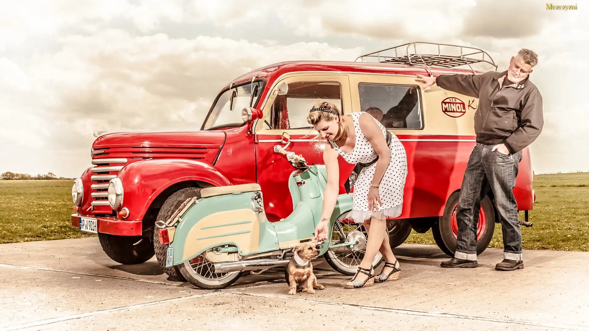 Kobieta, Mężczyzna, Samochód, Skuter, Pies, Wycieczka