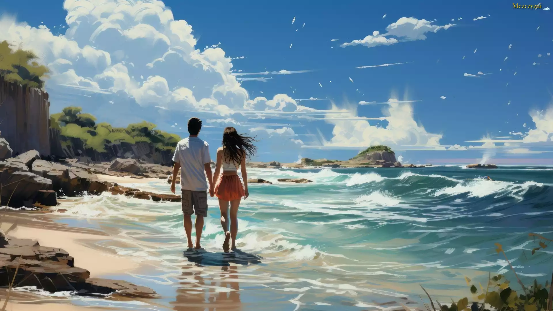 Kobieta, Mężczyzna, Para, Plaża, Morze, Fale, Skały, Lato, Grafika