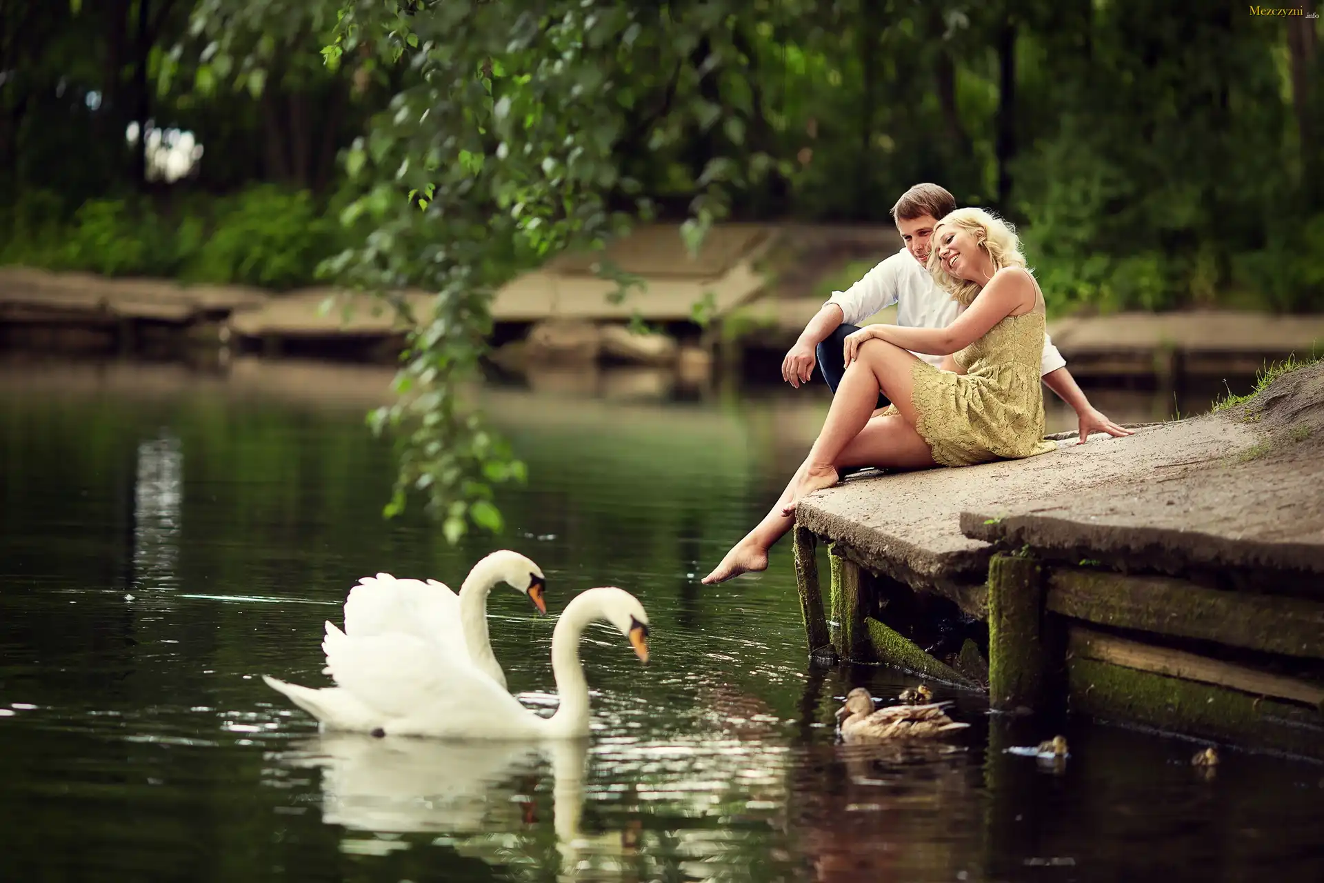 Kobieta, Mężczyzna, Pomost, Staw, Łabędzie