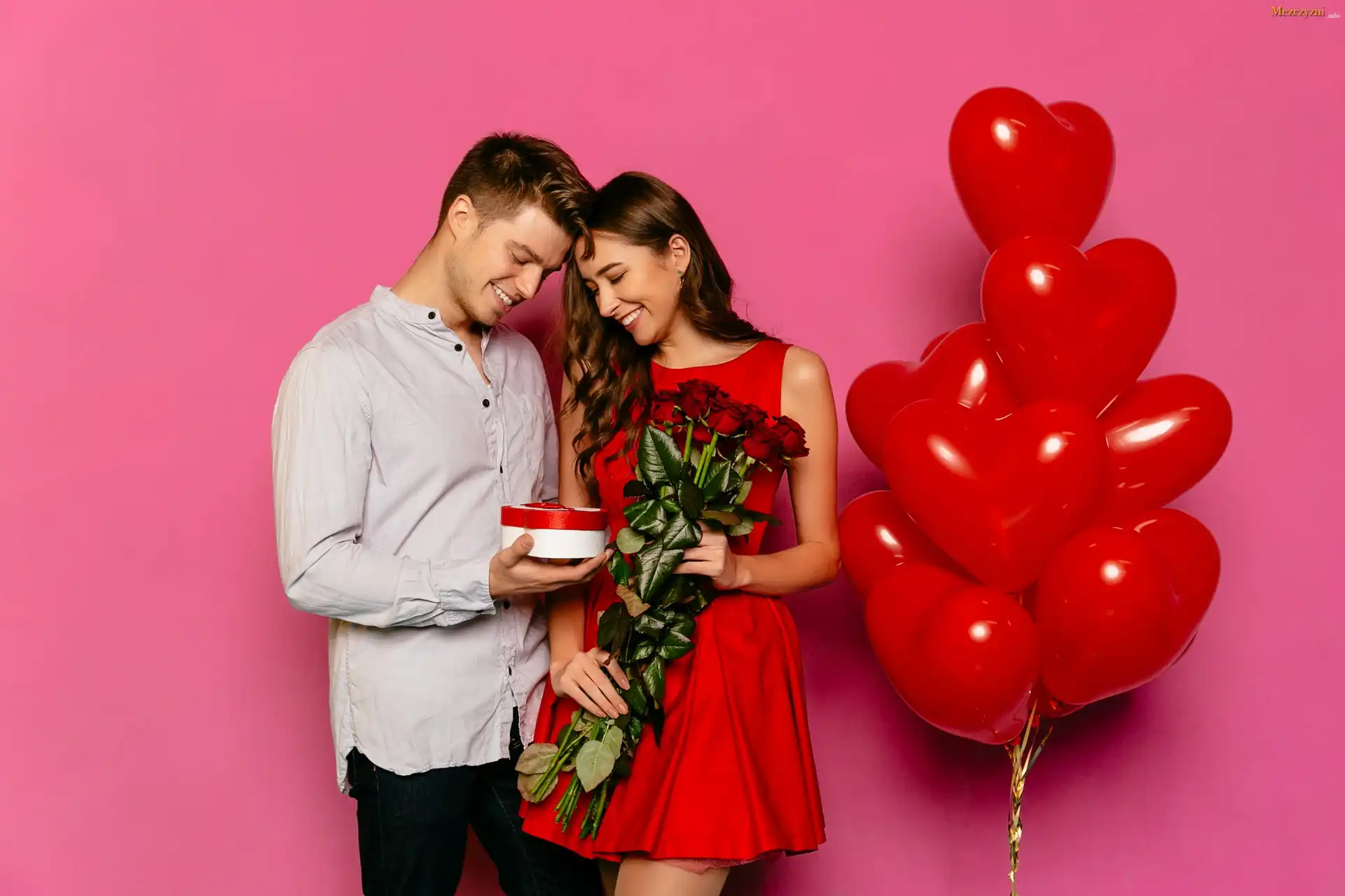 Mężczyzna, Kobieta, Prezent, Bukiet, Róż, Czerwone, Balony, Walentynki