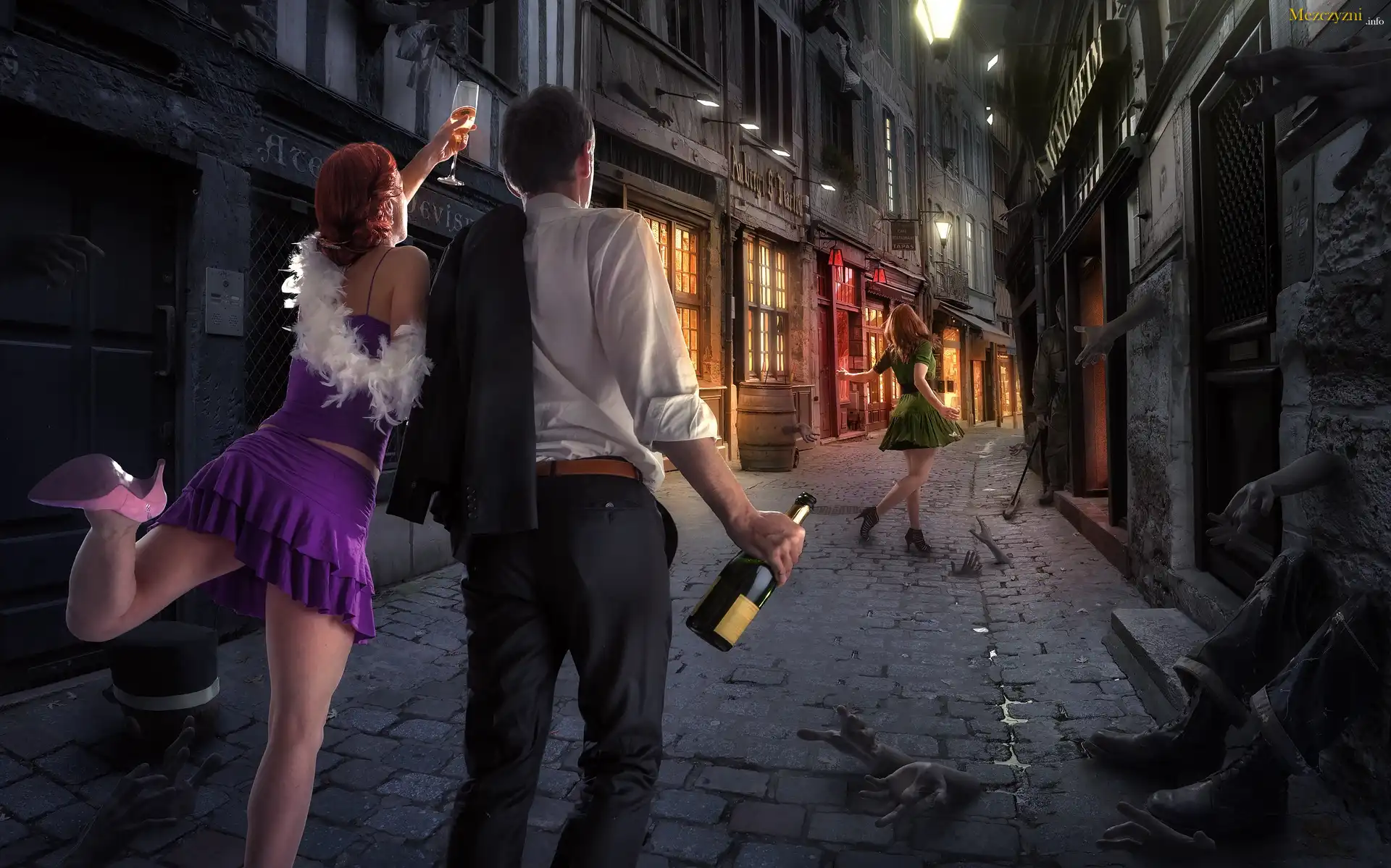 Kobiety, Mężczyzna, Ulica, Domy, Fantasy