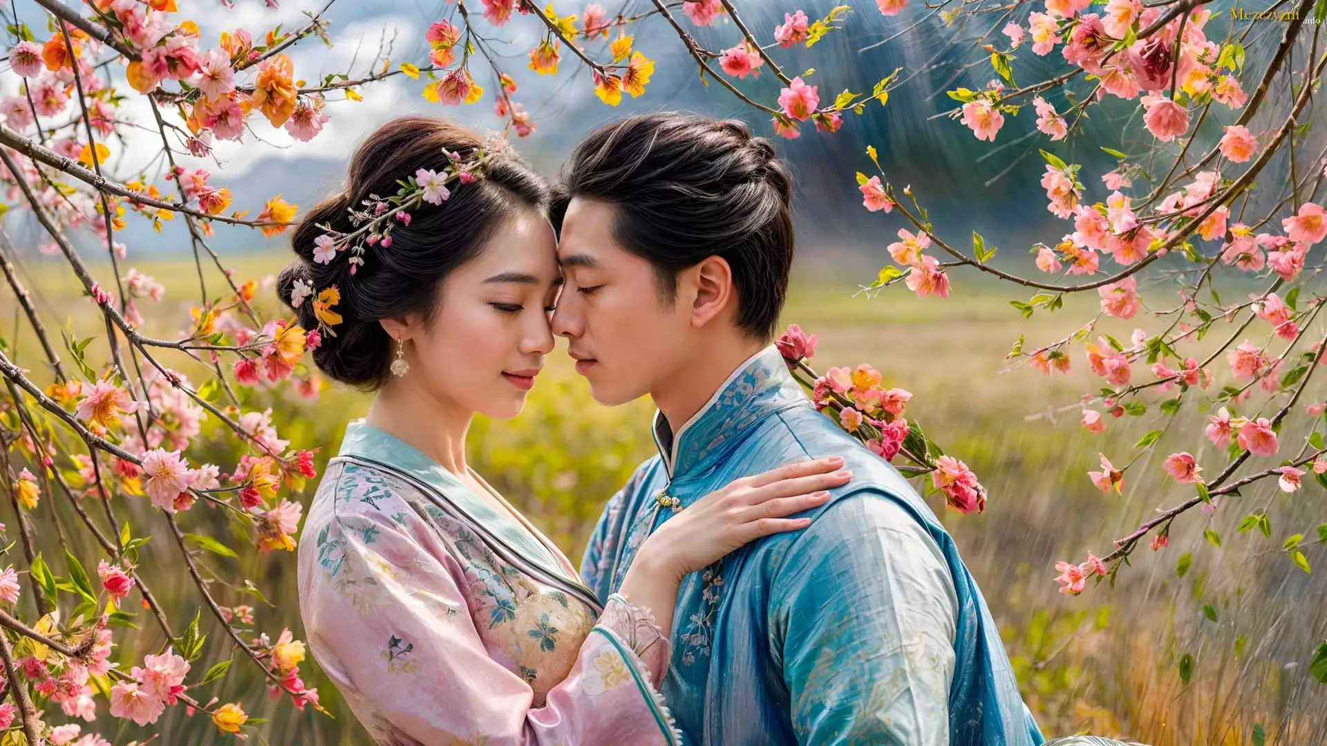 Kobieta, Mężczyzna, Azjaci, Kwiaty, Gałęzie, Zakochani