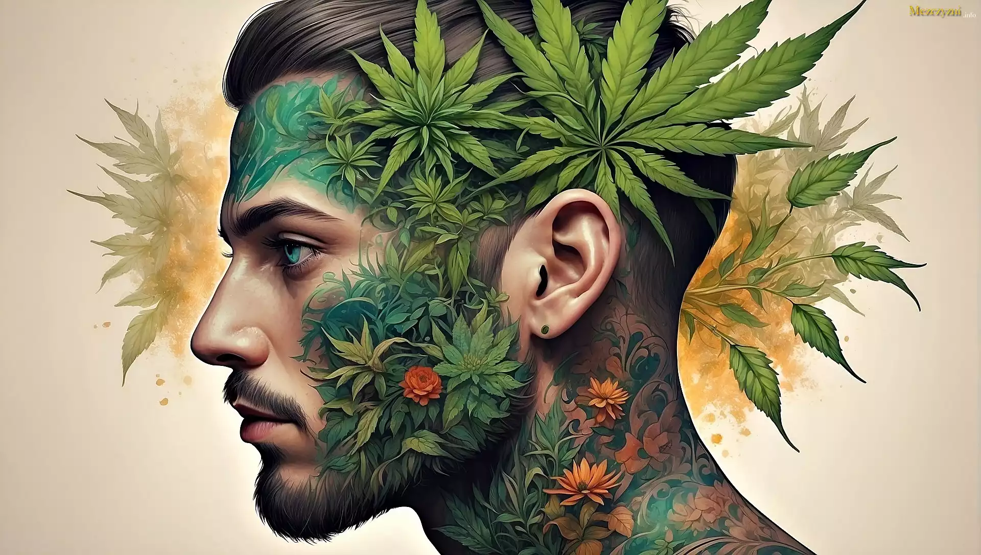 Mężczyzna, Profil, Tatuaże, Listki, Kwiaty, 2D