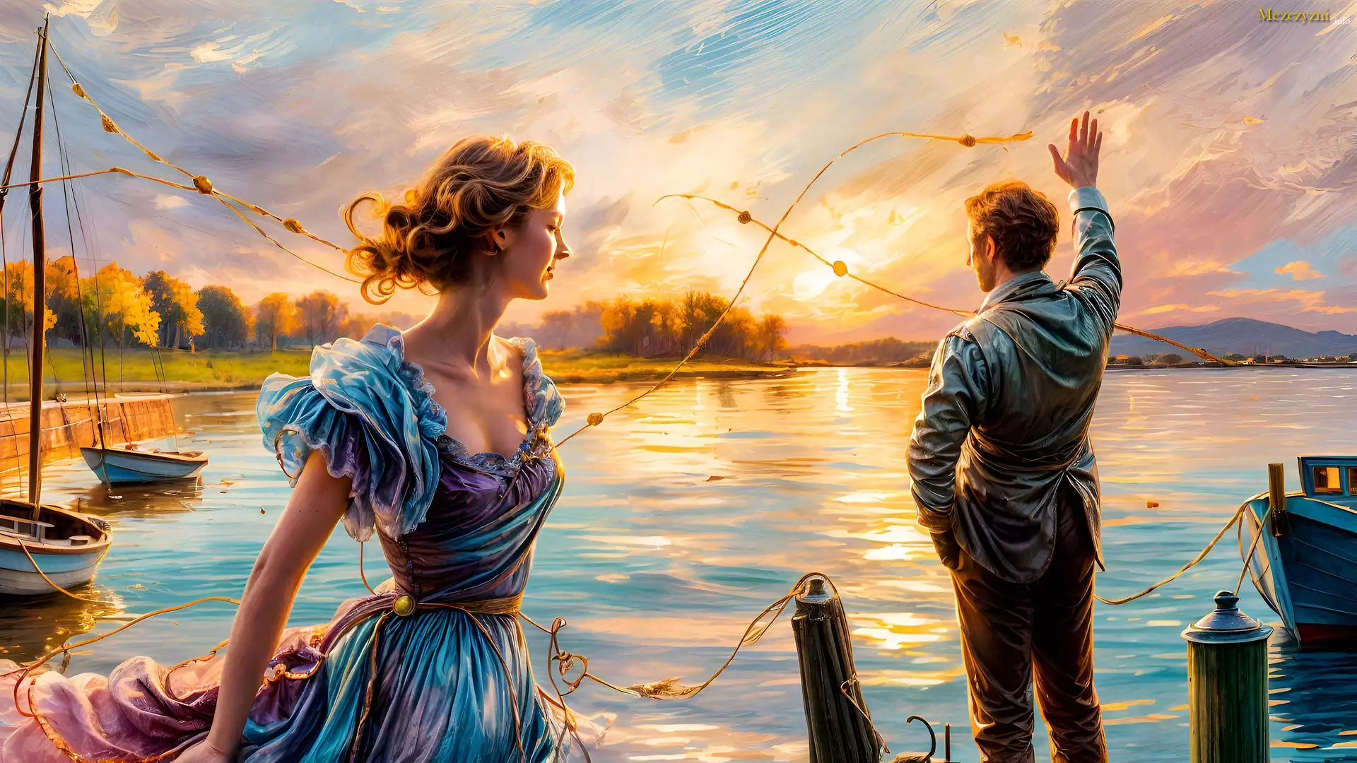 Kobieta, Mężczyzna, Jezioro, Łódki, Zachód słońca, Grafika