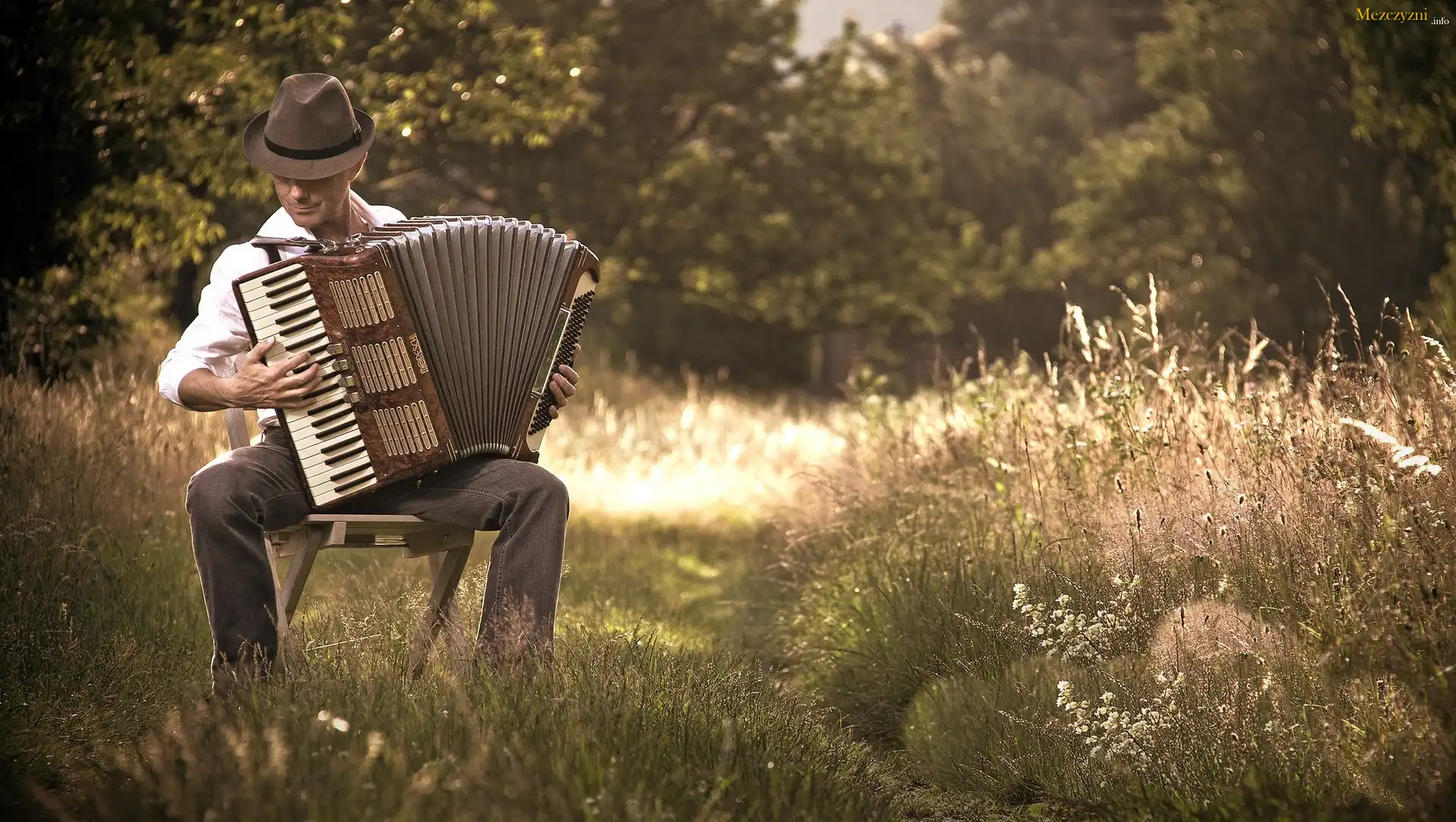 Mężczyzna, Kapelusz, Akordeon, Łąka