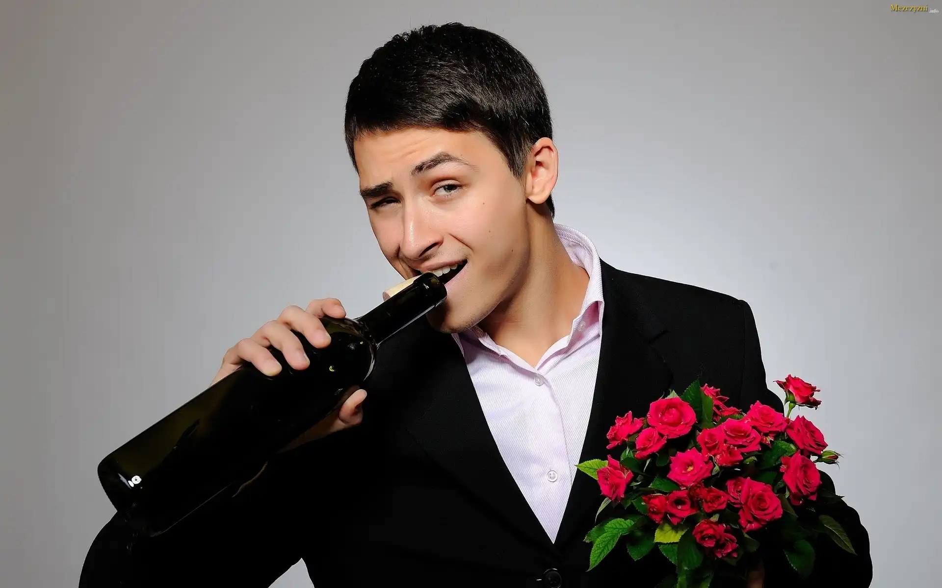 Mężczyzna, Uśmiech, Butelka, Bukiet, Róż