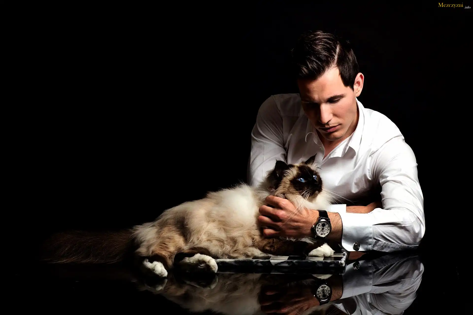 Mężczyzna, Kot himalajski, Czarne Tło
