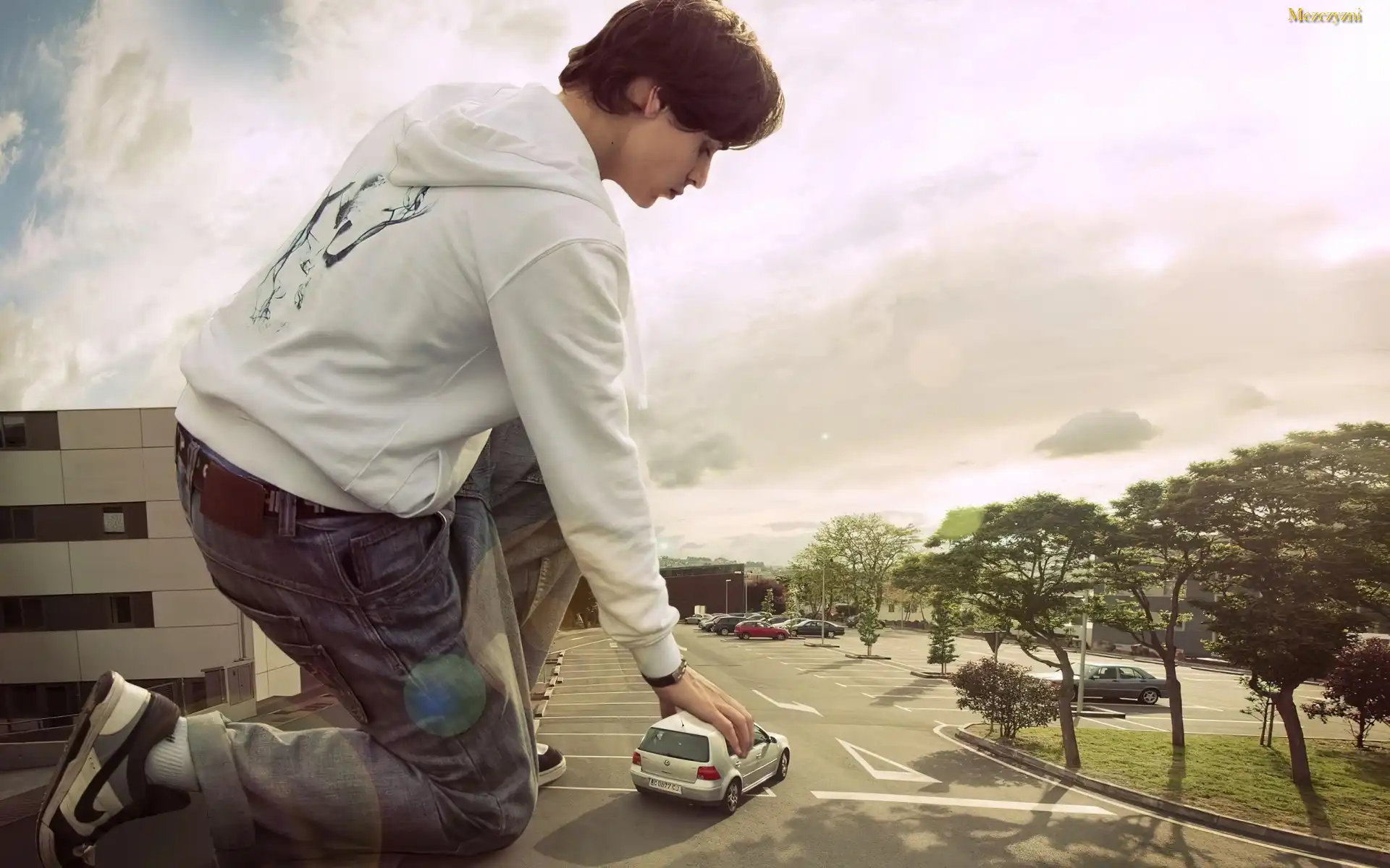 Mężczyzna, Gigant, Auto, Drzewa, Dom, Ulica