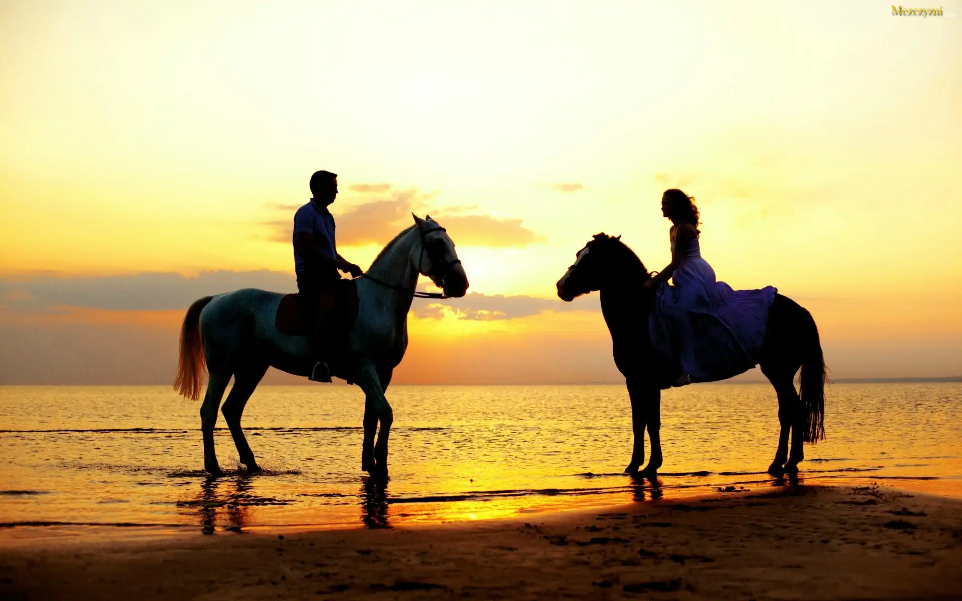 Kobieta, Mężczyzna, Konie, Plaża, Morze, Zachód, Słońca