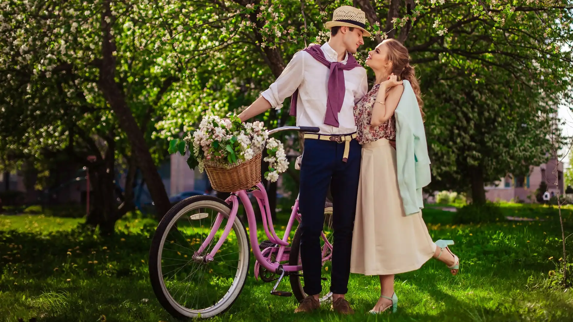 Kobieta, Mężczyzna, Rower, Bukiet kwiatów, Ogród, Wiosna