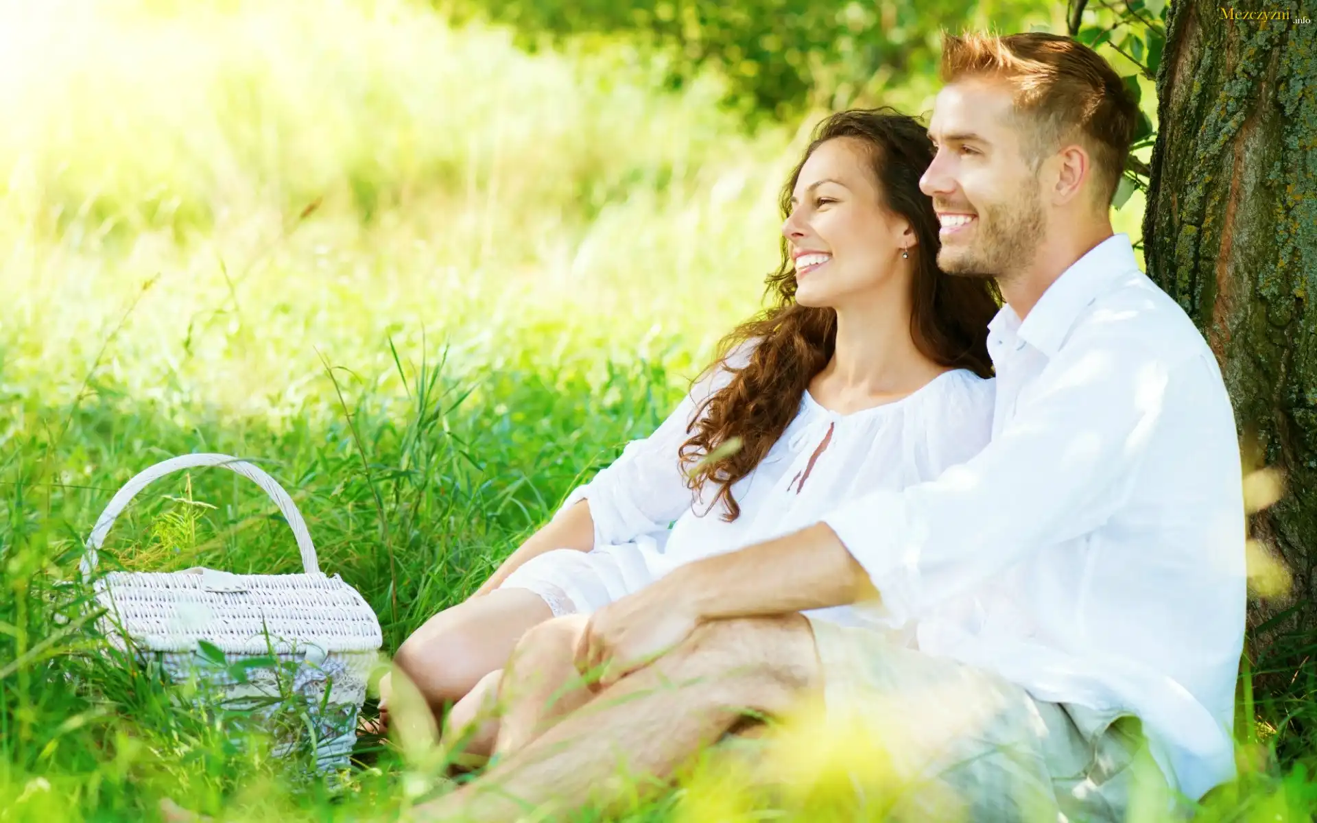 Kobieta, Mężczyzna, Łąka, Drzewo, Piknik, Światło, Wiosna