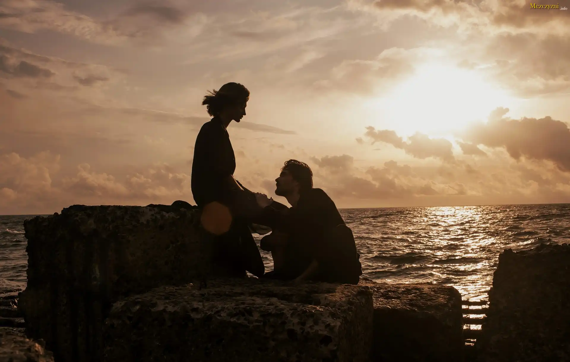 Mężczyzna, Kobieta, Para, Morze, Skały, Zmrok