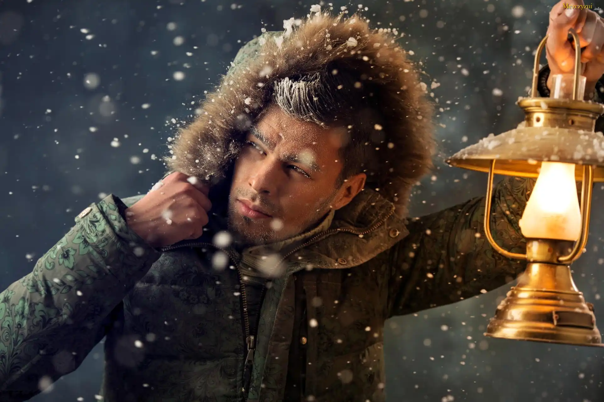 Mężczyzna, Model, Lampa, Zima, Śnieg