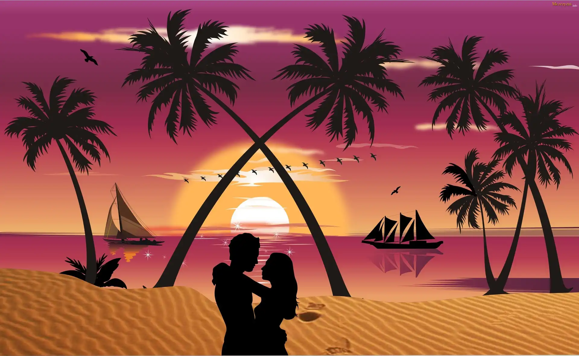 Morze, Plaża, Palmy, Mężczyzna, Kobieta